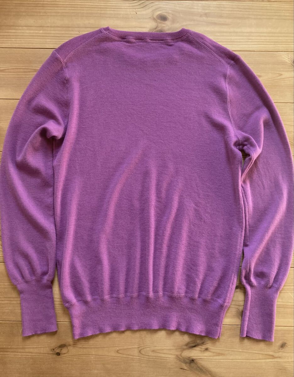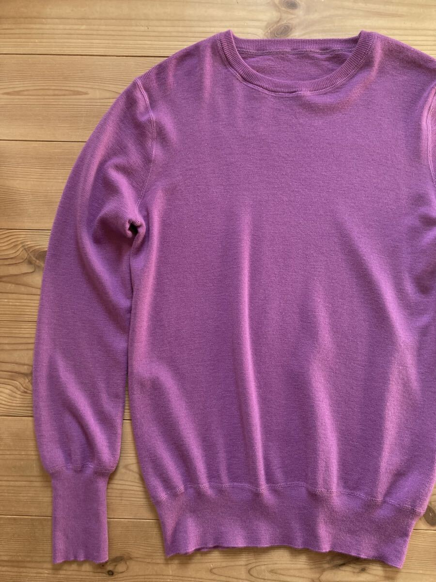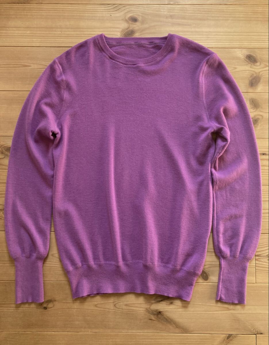 ベーシックなクルーネックのニットですが、きれい色と肌触りの良いウール素材が特徴です。襟周りや裾など少しスウェットやカットソーのような作りになっているのもポイントです。