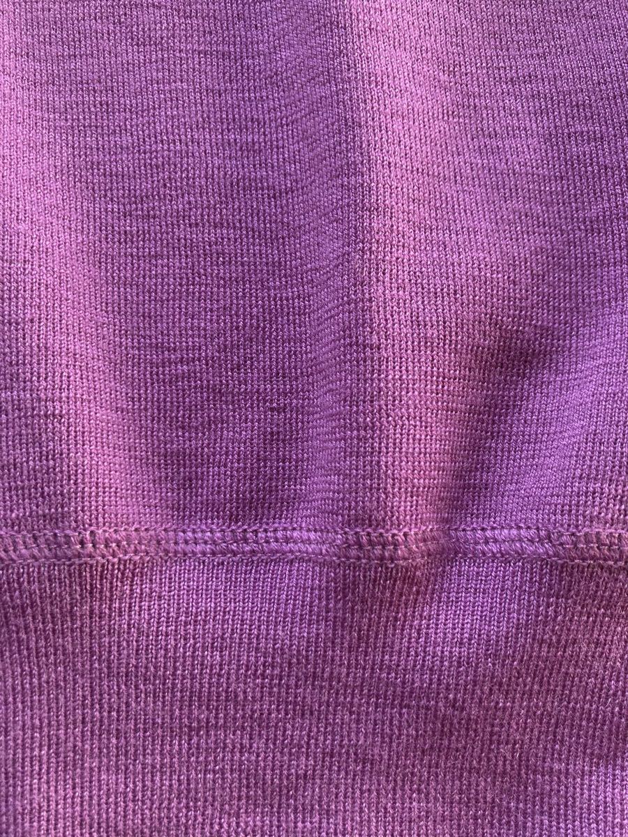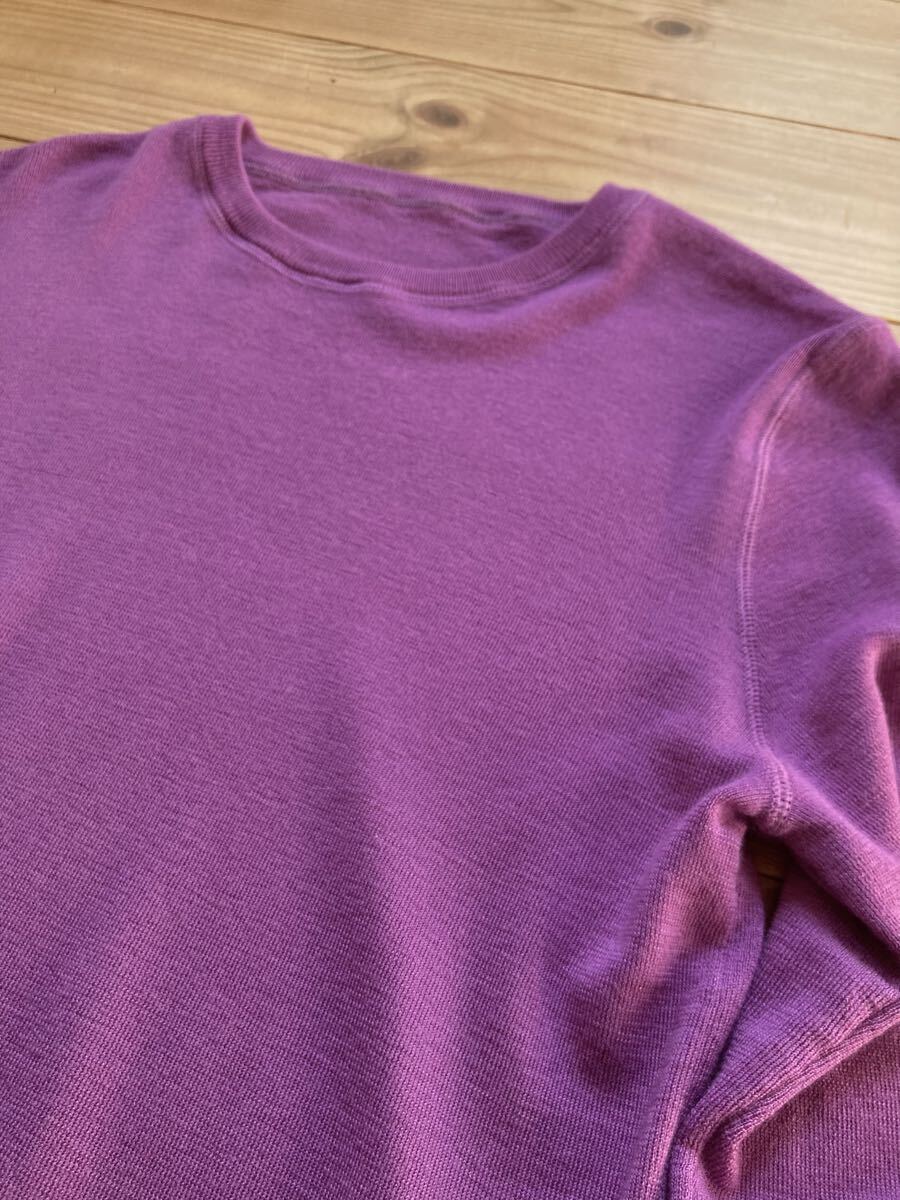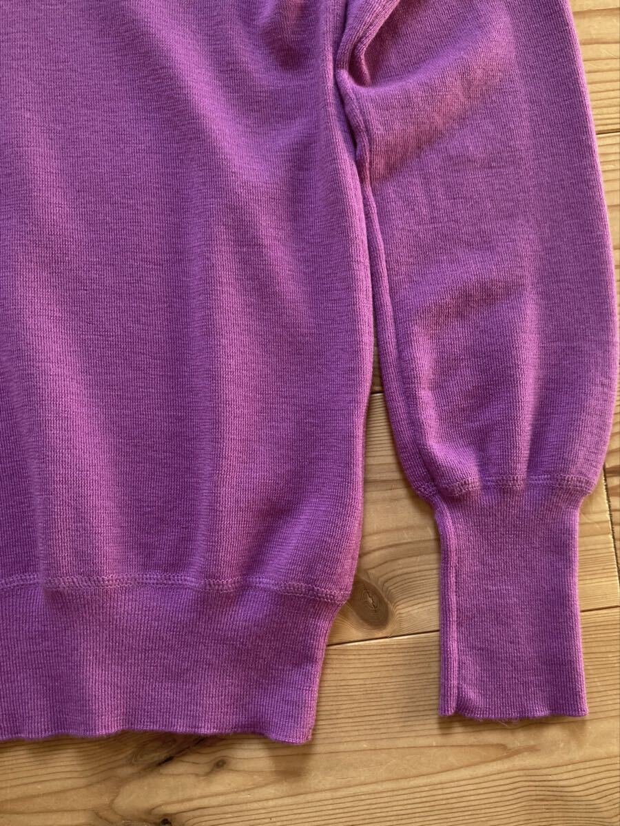 ベーシックなクルーネックのニットですが、きれい色と肌触りの良いウール素材が特徴です。襟周りや裾など少しスウェットやカットソーのような作りになっているのもポイントです。