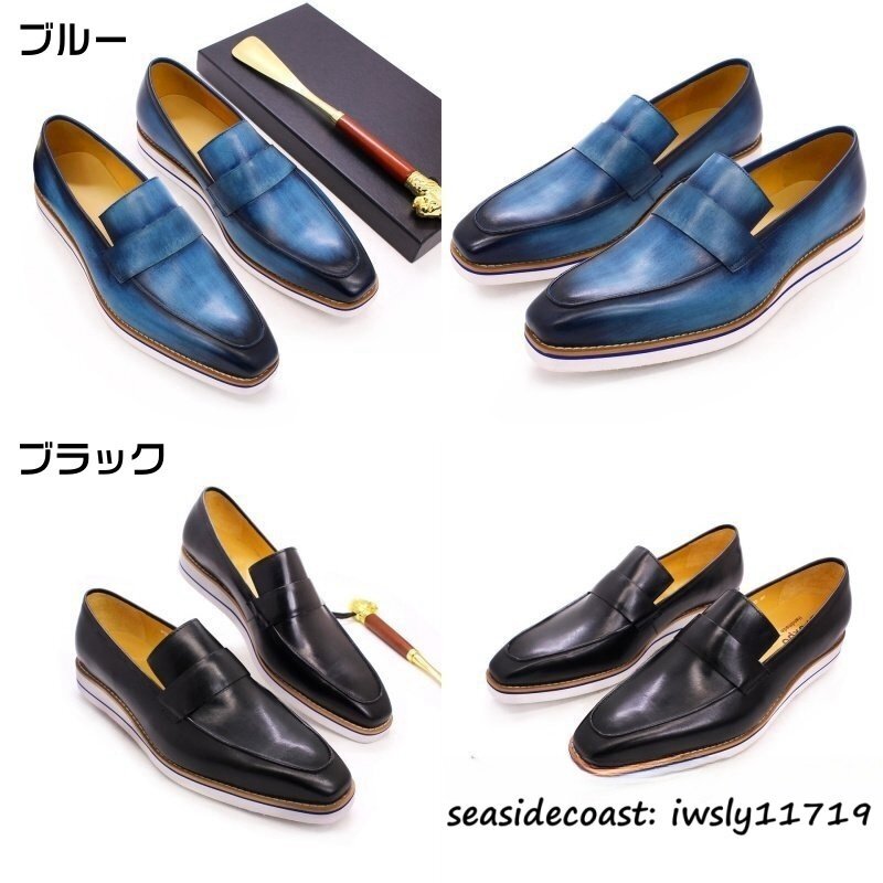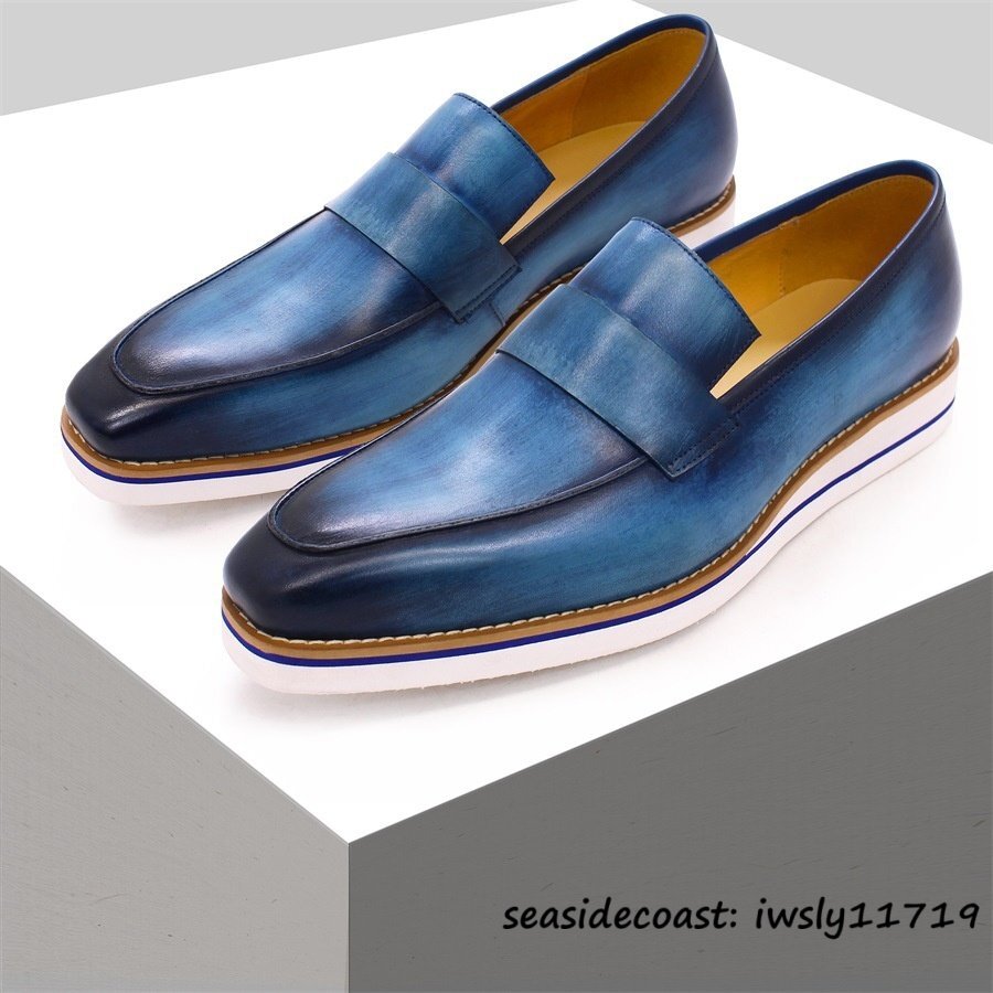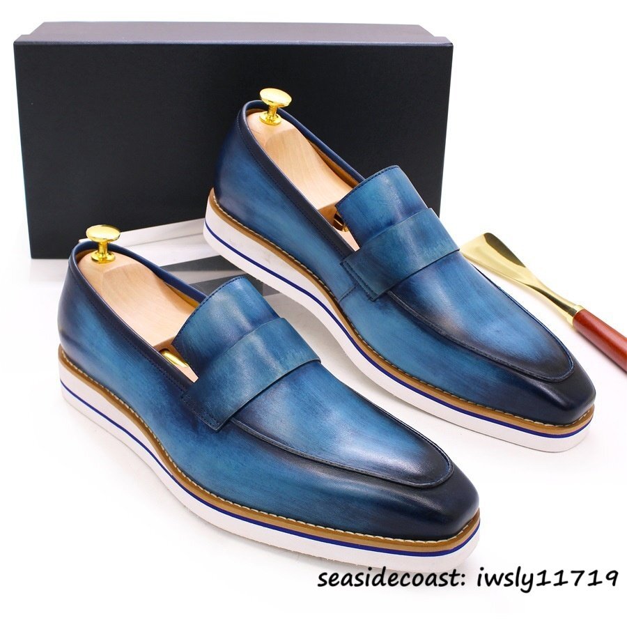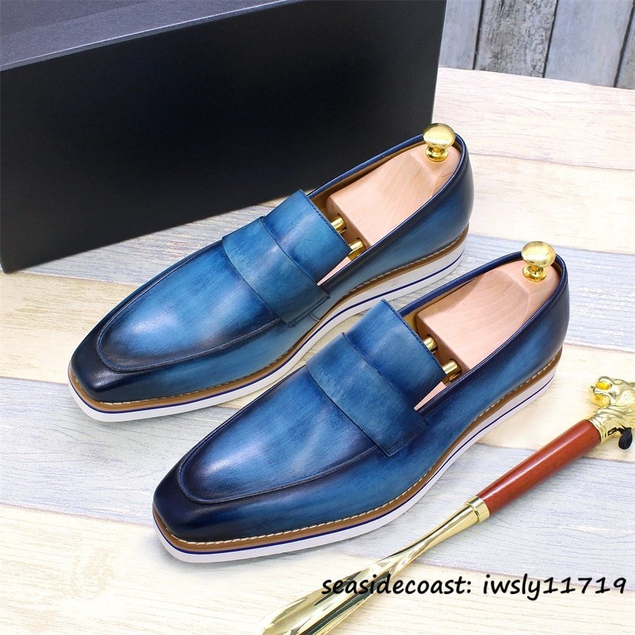 最高級*10万超 メンズ ローファー スリッポン職人手作り 本革 レザーシューズ 牛革 紳士靴ドライビングシューズ 軽量 革靴 ブルー 27.5cm