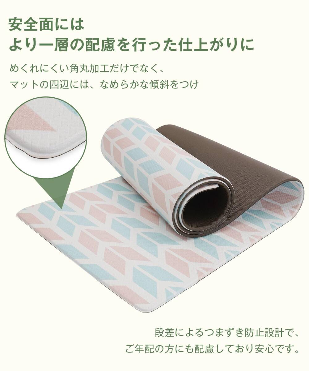 ・「足が疲れにくい・ソフトな踏み心地」程よい厚みとクッション性のあるソフトな踏み心地で長時間の立ち仕事による足への負担を軽減します。厚さがあるので、冬場に床からの冷気も和らげます。物が落下しても衝撃を吸収し、床をキズやヘコミから守ります。