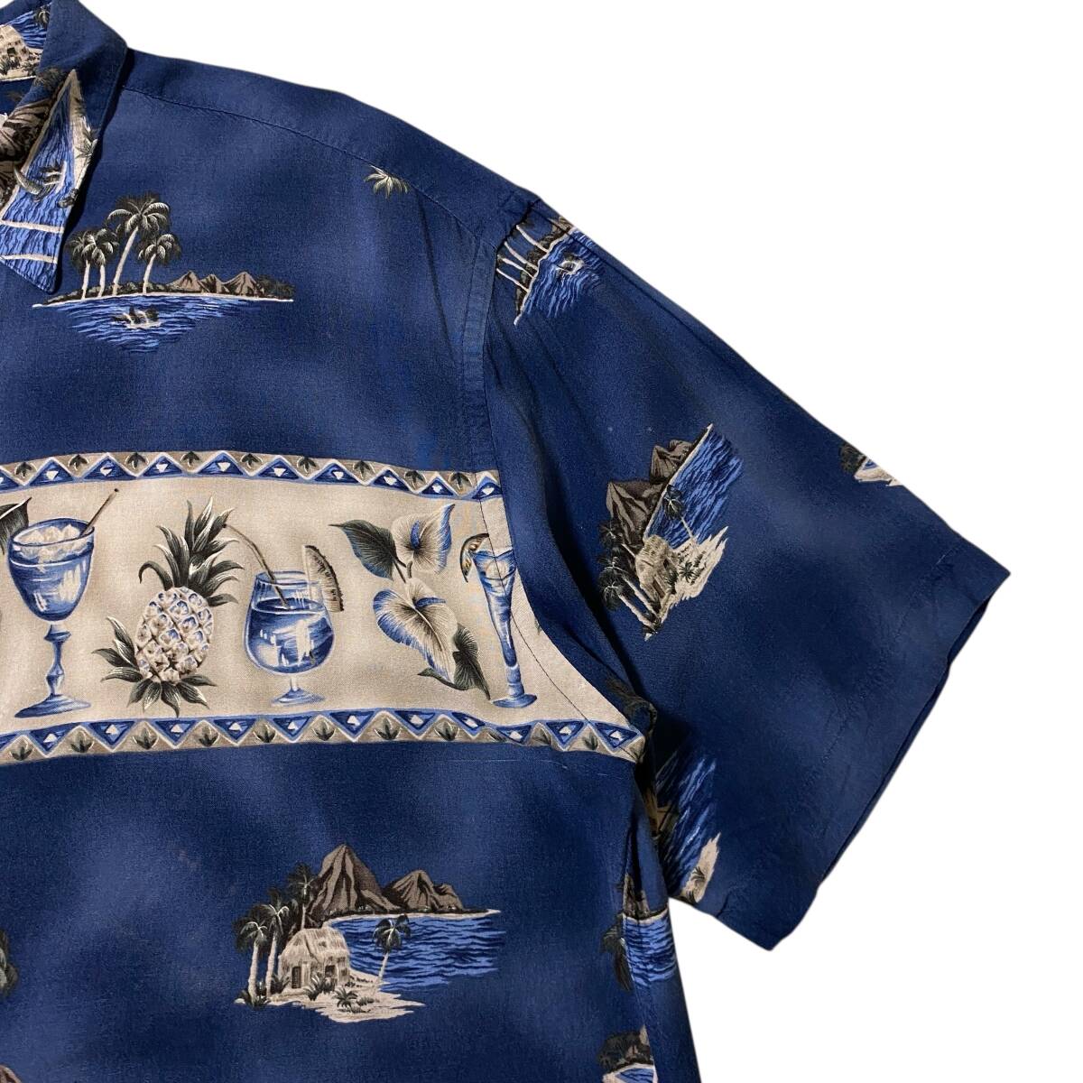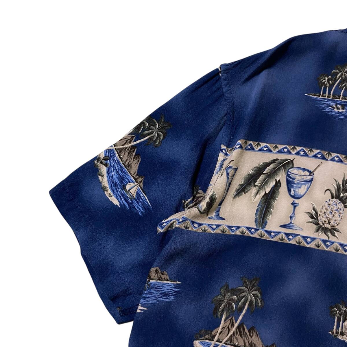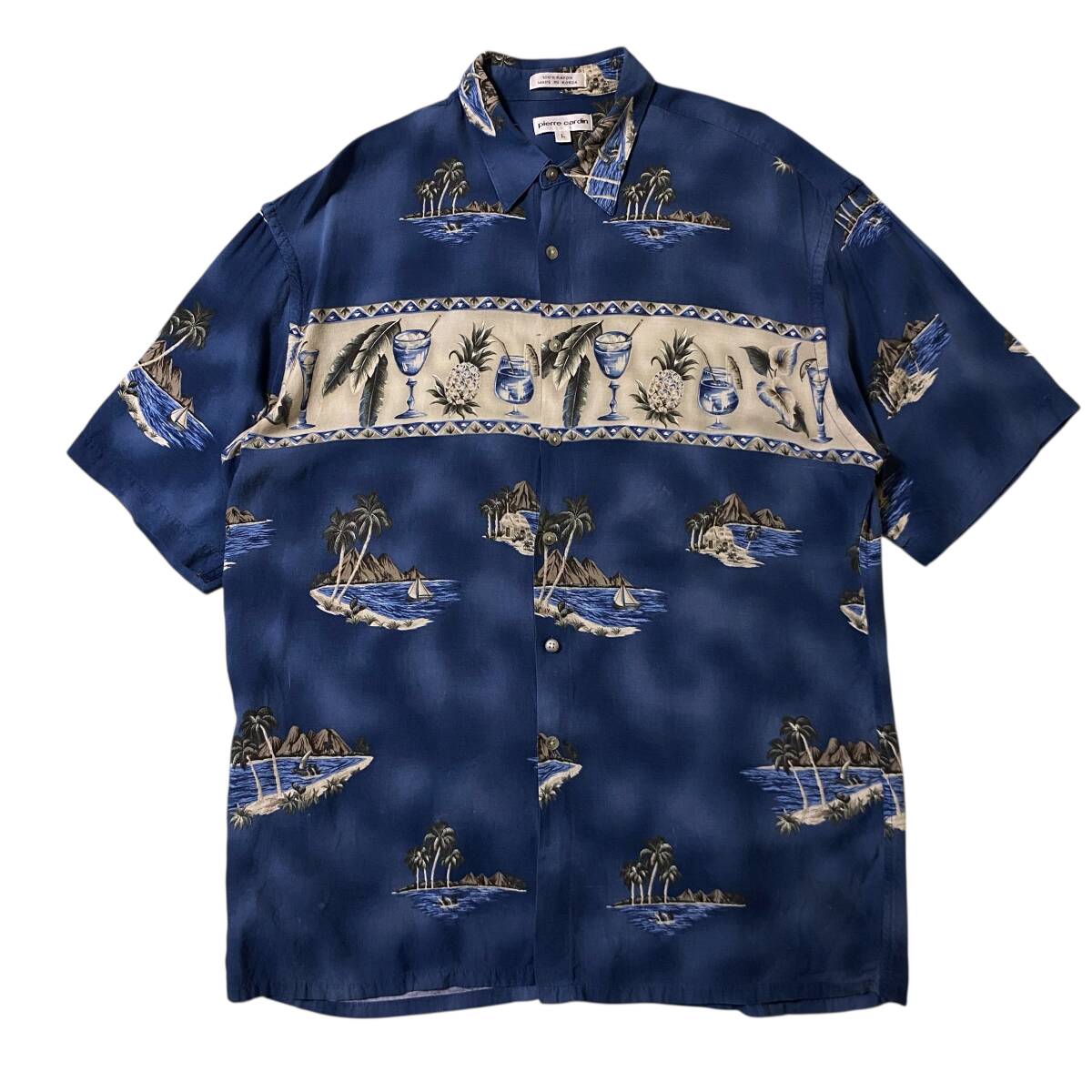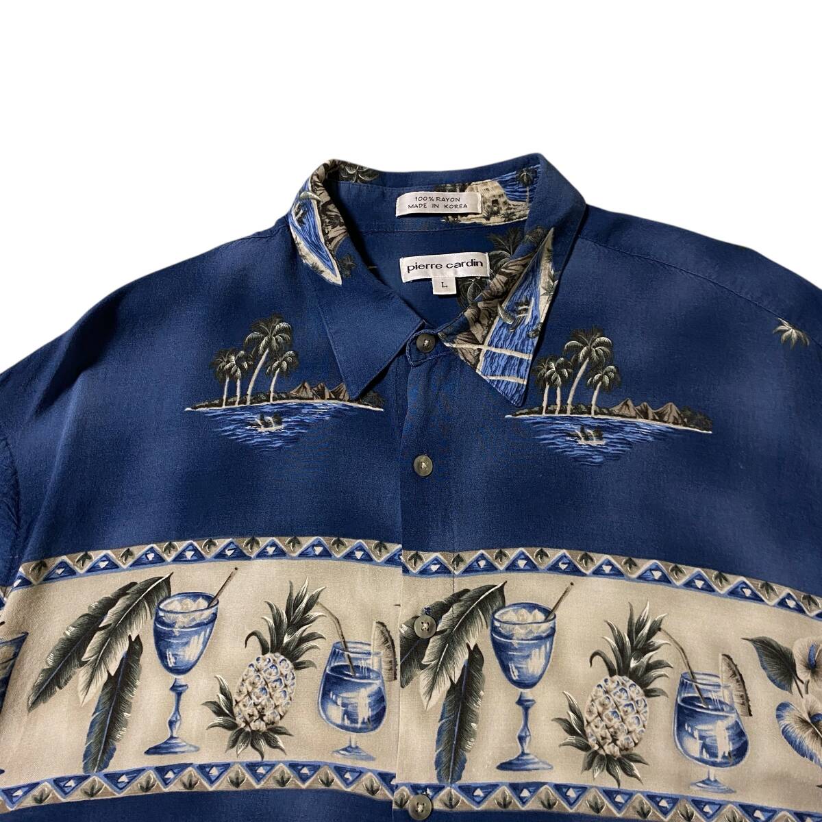 アメリカ古着 ピエールカルダン アロハシャツ ハワイアン レーヨン ネイビー Lサイズ ヴィンテージ 【AL453】