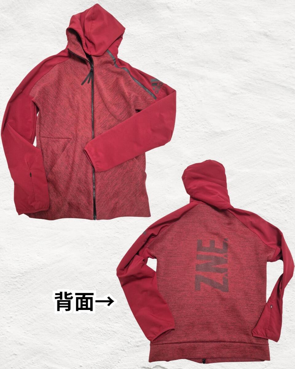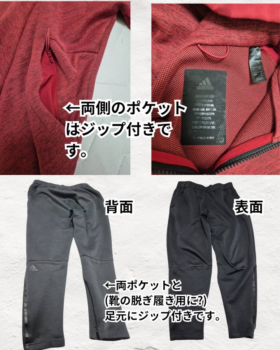 ADIDASのフード付きフルジップジャケットとロングパンツの上下セット、Lサイズ、両側にジップ付きポケット。