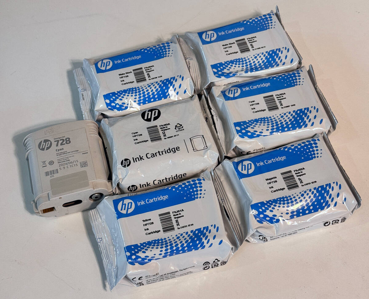 【新品未開封】HP728 F9J61A~63A 40mlインクカートリッジ 純正品 7本セット+おまけ(300mlブラック互換品)