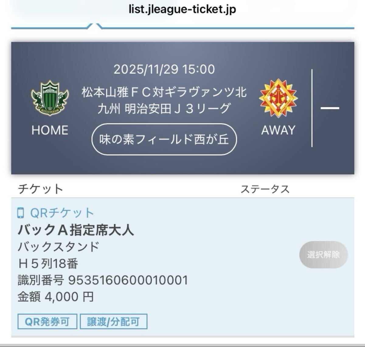 松本山雅VSギラヴァンツ北九州のバックA指定席大人1枚