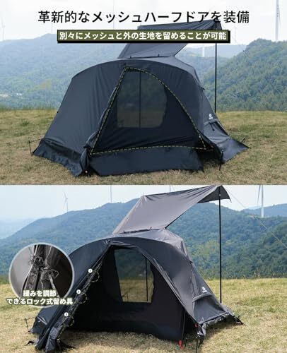 【通気性抜群ー革新的なメッシュハーフドア】前後ドアは開閉でき、どちらからも出入り可能!また、後側はB3素材なメッシュハーフドアを装備、蚊や虫を防ぎ、開けたままにすることで通気性を更に向上します。フラップは必要に応じてフルクローズでき、着換えやプライベート空間を確保できます。
