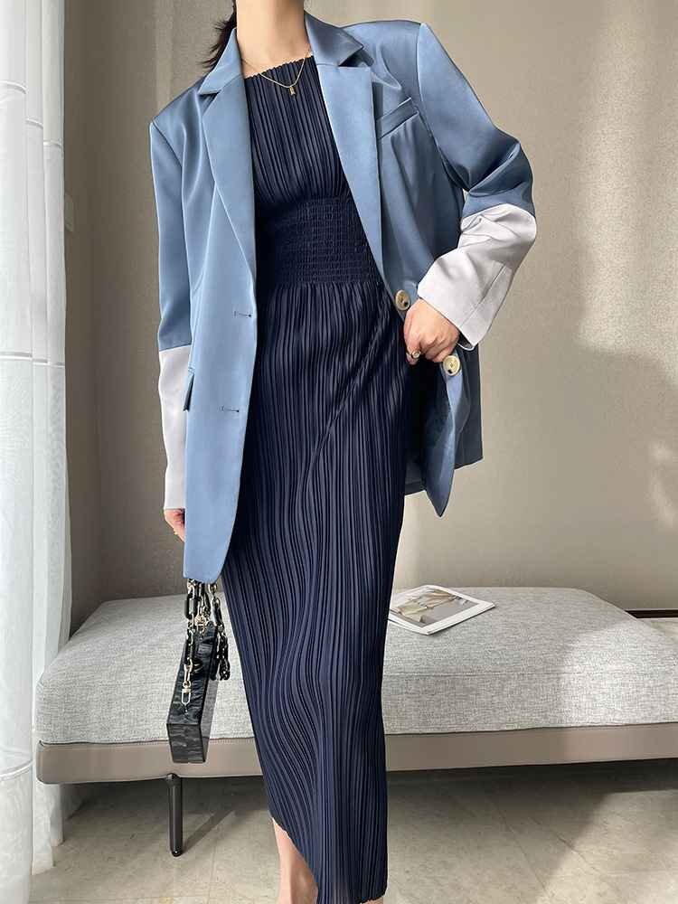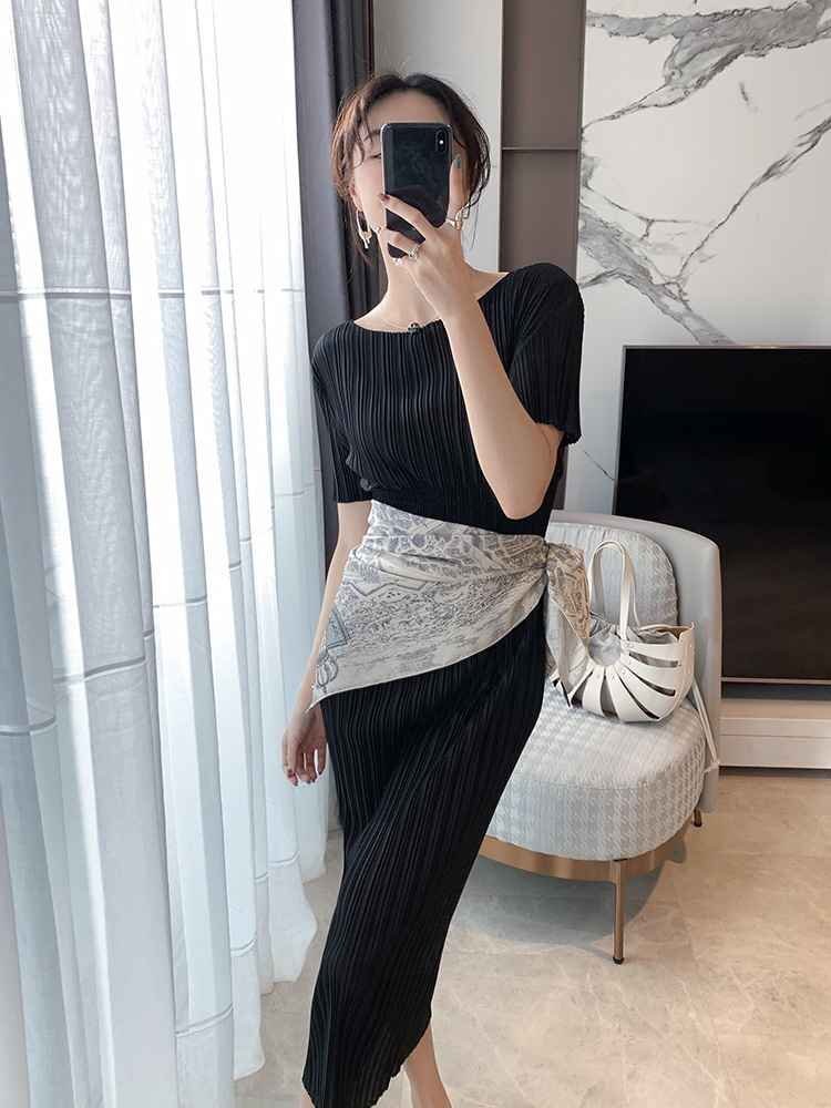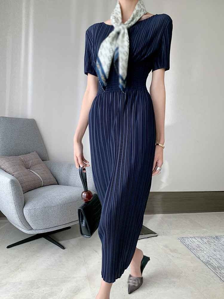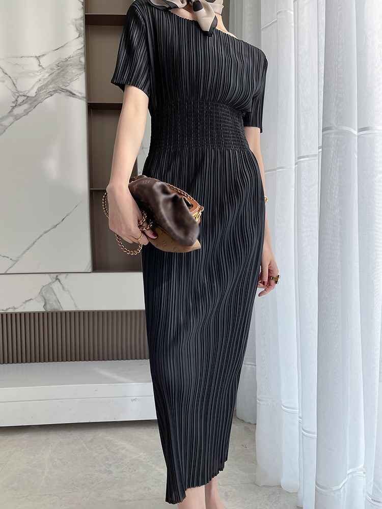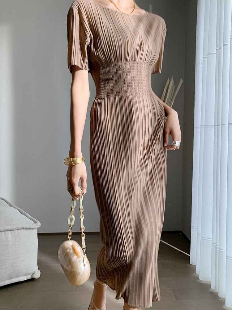 エレガント プリーツ スリム ハイウエスト 半袖 ワンピース XL ブラウン