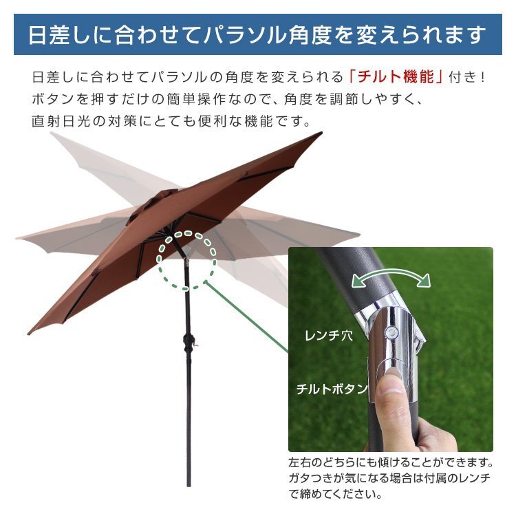 | 日差しを遮り、屋外スペースを憩いの場に! 組立簡単!ポールを繋げハンドルを回すことでパラソルを開閉できます。 日差しに合わせてパラソルの角度を変えられる「チルト機能」付き! ボタンを押すだけで左右どちらにも角度を調節できます。 パラソル生地は紫外線を約80%カットし、風通しのよいベンチレーション付きです。 また、撥水加工が施されており、急な雨にも安心です。 アルミ製の支柱で木製パラソルと比較し、軽くて水やサビに強く長くご使用いただけます! 【商品仕様】 カラー:グレージュ 素材:ポリエステル、スチール、アルミ 重量(約):4.6kg サイズ(約) ・使用時:傘幅270cm×高さ240cm ・収納時(パラソル):140cm×25cm ・収納時(ポール):長さ110cm ・ポール直径:3.8cm ※大型商品のため、特別中継料が適用されます。(北海道+1,100円/沖縄本島+2,200円/離島+2,200円) (270 2.7m ビーチパラソル 日除け 紫外線 日差し ベース スタンド 土台 セット 自立 チルト 角度調整 ガーデン ガーデニング ベランダ テラス アウトドア キャンプ BBQ レジャー ピクニック ビーチ 海 人気 おすすめ WEIMALL) |