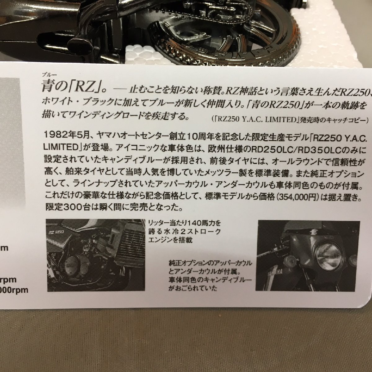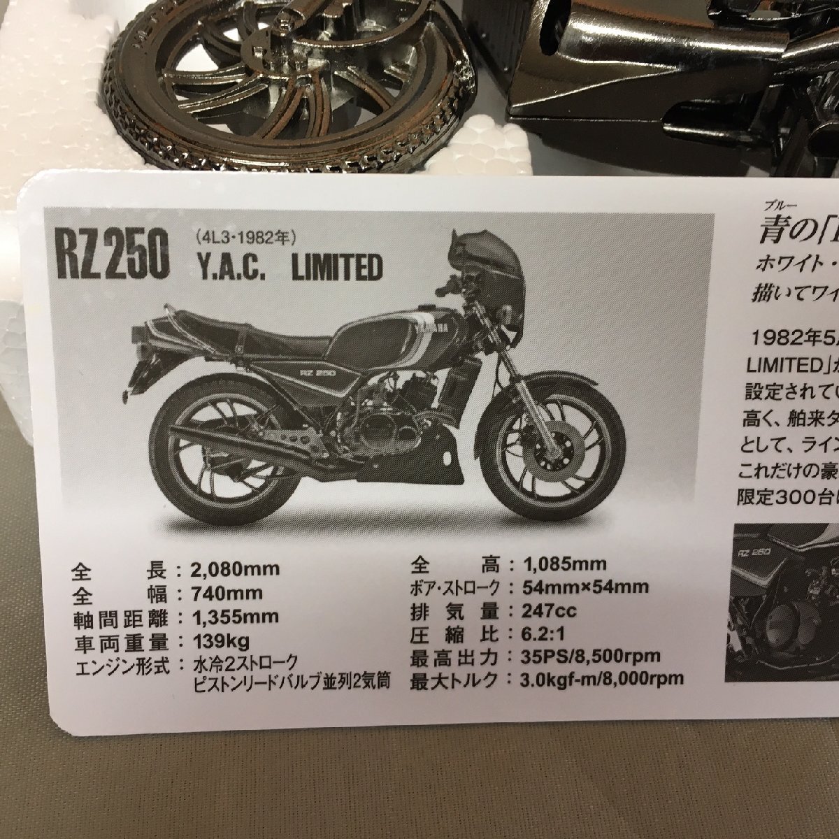 ■ヤマハオートセンター創立10周年記念 ■RZ250 ■状態:中古品A ■ミニレプリカ ■付属品:元箱 ※元箱に傷み・汚れあり |