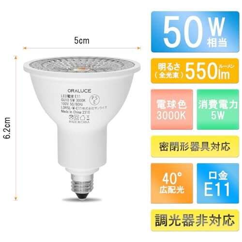 ORALUCE LED電球 E11口金 ハロゲン電球 50W形相当 電球色 3000K 5W 550lm 40°配光角 集光タイプ スポットライト 密閉型器具対応 ダクトレール照明 間接照明 商業照明 看板 ダイニング リビング照明 調光不可 6個セット LDR5L-W-E11