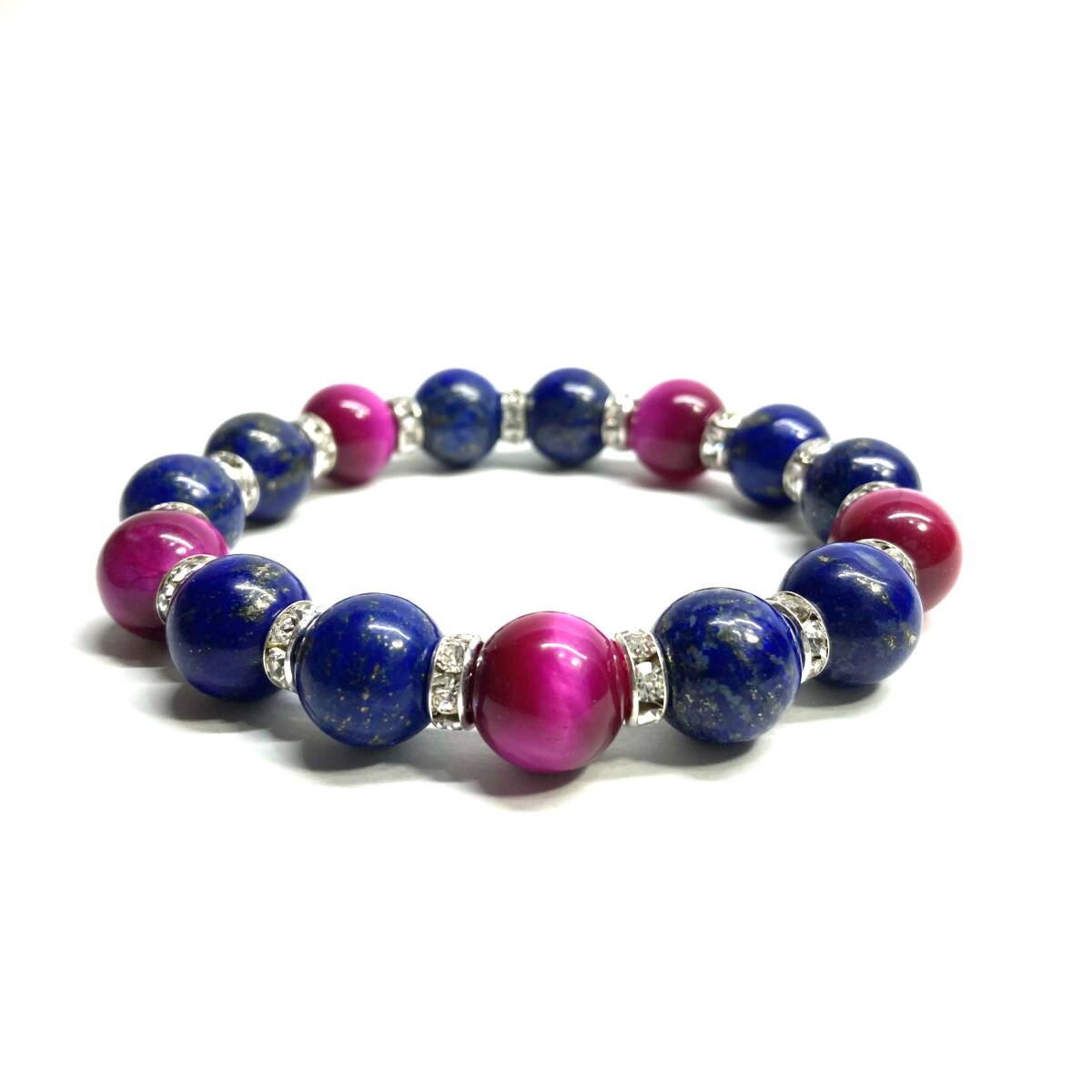 こちらは、ラピスラズリとピンクタイガーアイを組み合わせたパワーストーンブレスレットです。間にはロンデルを挟み高級感あるデザインに仕上げております。程よくインパクトがある12mm玉を使用して内周約18cmです。(サイズ変更の場合は取引ナビにてご連絡をお願いします。) 数に限りがございますので気になる方はお早めにどうぞ。