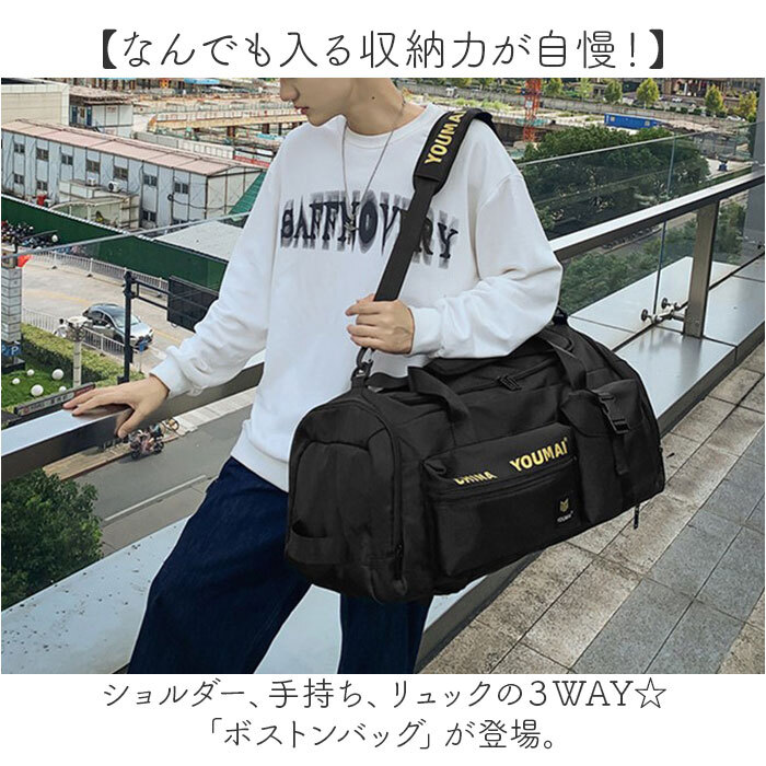 | 商品説明 | ・・【なんでも入る収納力が自慢!】 ・ショルダー、手持ち、リュックの3WAY☆「ボストンバッグ」が登場。 ・【ガバっと開いてザクザク収納】 ・大きく開くコの字の開口部でバッグの中身が一目瞭然。必要な物がザクザク入る◎ ・【驚きの3WAY仕様でリュックにも◎】 ・底部のファスナーを開けるとリュック用ストラップが登場。ショルダー、手持ちもOK! ・【ポケットがたくさんで整理整頓!】 ・外側にたくさんポケットを配置。メイン収納を開けなくても小物をとりだしできる! ・【独立シューズルームを搭載】 ・サイドにはシューズルームがあり、旅行だけでなく、ジムや合宿、アウトドアなどでも活躍。 ・【キャリーオン機能を搭載】 ・背面にキャリーオンベルトがあるので、スーツケースにつけることも◎出張にも最適。 ・【誰が持っても様になるシンプルさ】 ・年齢性別を問わずに使えるシンプルデザイン◎家族みんなで使ったりお揃いにするのもGOOD ・【ポケット仕様】 ・メイン収納:ファスナーポケット×1 ・背面:ファスナーポケット×1 ・サイド:シューズルーム×1、ファスナーポケット×1 ・フロント:ファスナーポケット×1、フラップポケット×1 |