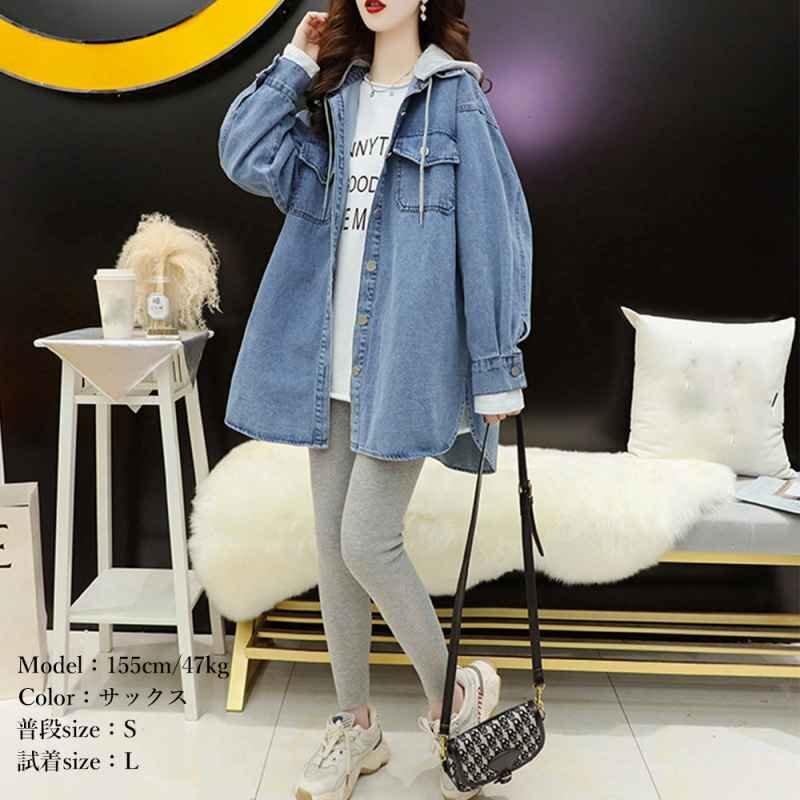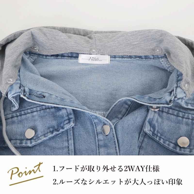 カジュアルコーデ、可愛いコーデ、大人っぽいコーデなど幅広いコーデに使えるフード付き デニムジャケット