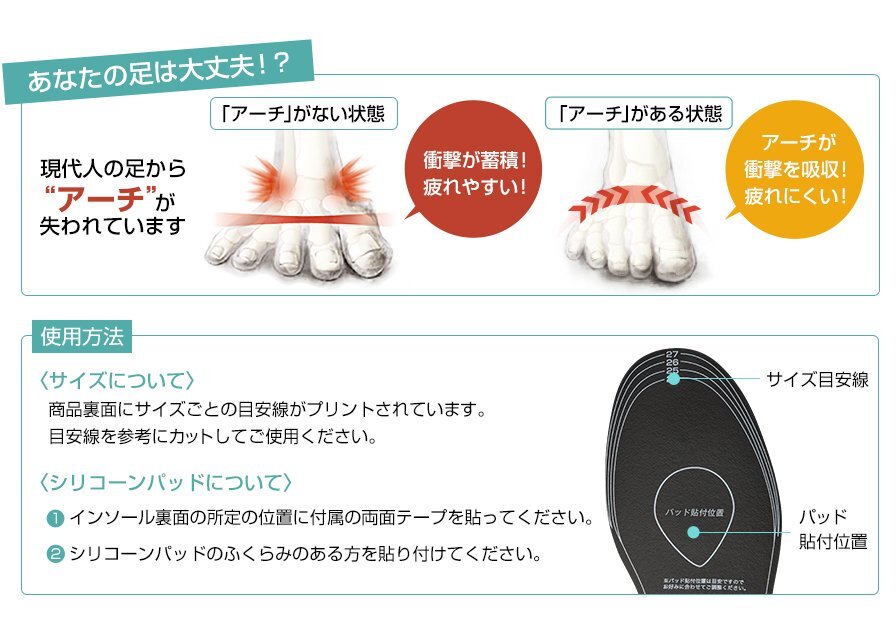 シリコーン製の足裏パッドが足裏の筋肉を伸ばし、横アーチを整えるので歩いても足が疲れにくい。