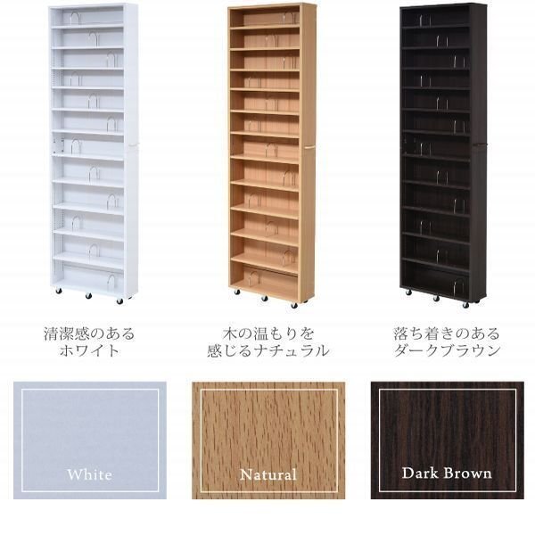 | 【カラー】 ダークブラウン、ナチュラル、ホワイト 【サイズ】 <外寸> 幅16.5×奥行55(取っ手含む58)×高さ200cm <内寸> オープン部:幅51×奥行14.5(有効15)×高さ191cm 可動棚:幅51×奥行14×厚み1.5cm(1cmピッチ170穴) 【材質】 本体:プリント紙化粧合板 【耐荷重】 可動棚:5kg以下 【収納量】 文庫本:(約)308冊 コミック:(約)252冊 DVD:(約)252枚 CD:(約)504枚 Blu-ray:約(約)20枚 【生産国】 ベトナム 【梱包】 サイズ:120.5×23×24.5cm、重量:24.5kg 【その他】 ・可動棚:11枚 ・ブックスタンド:12本 ・転倒防止チェーン:2本 【組み立て品】 お客様による組み立てが必要です。 【ご注意】 ・サイズ、重量は概算です。 ・商品カラーはご使用のモニターによって実際の明るさや色と異なって見える場合がございます。 |