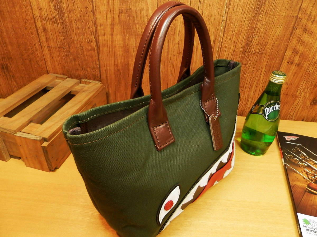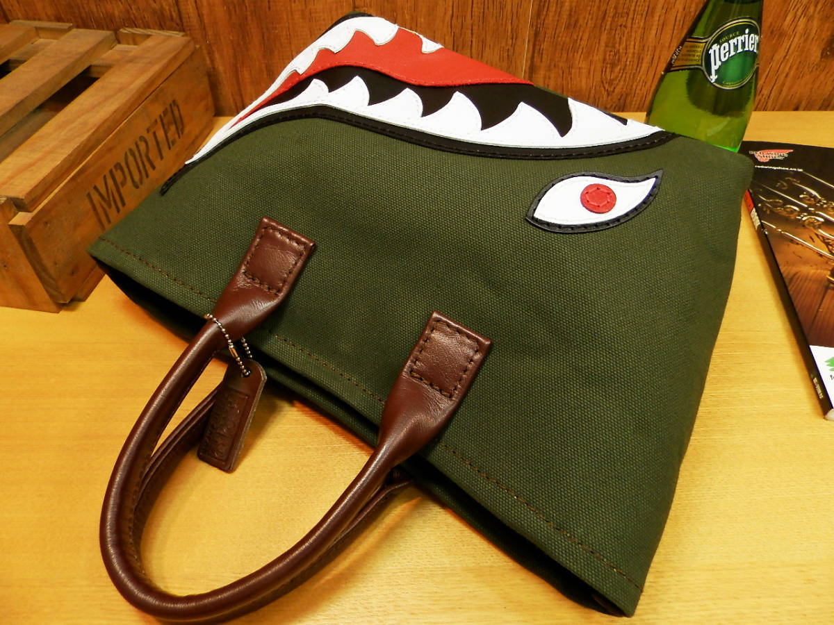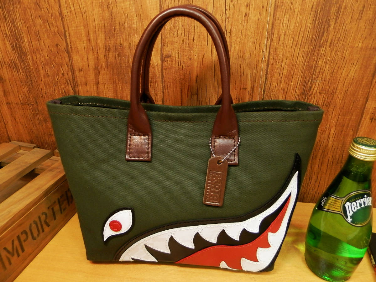 受注生産 可愛い☆厚手6号オリーブ防水帆布×本革シャークマウスのミニトートバッグ日本製ミリタリーSサイズ/シャークトゥース/アメリカ軍