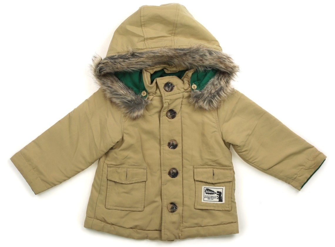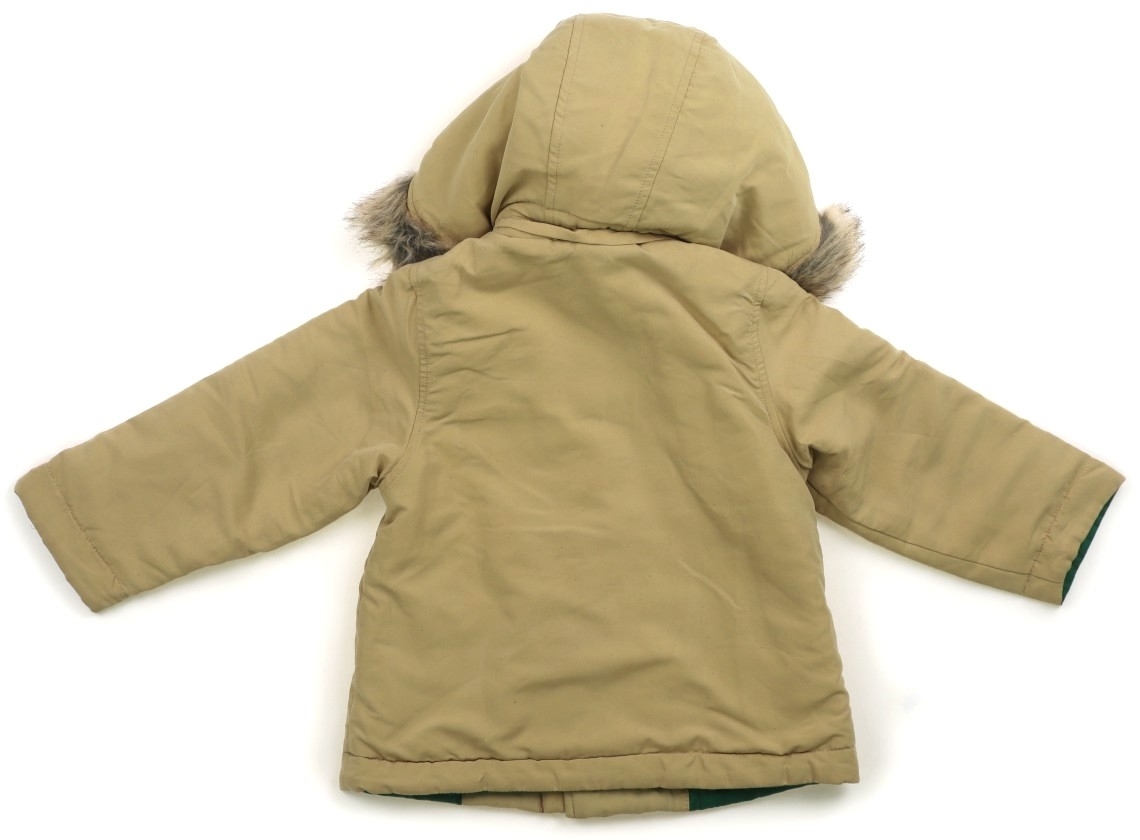 ピーチ加工の表地・裏地・中綿すべて薄手のポリエステル素材です。フェイクファーは縫い付け、フードの取り外しが可能です。袖口に薄汚れ、全体に毛羽の付着がありますが、まだまだ普段着として活躍してくれそうです。
