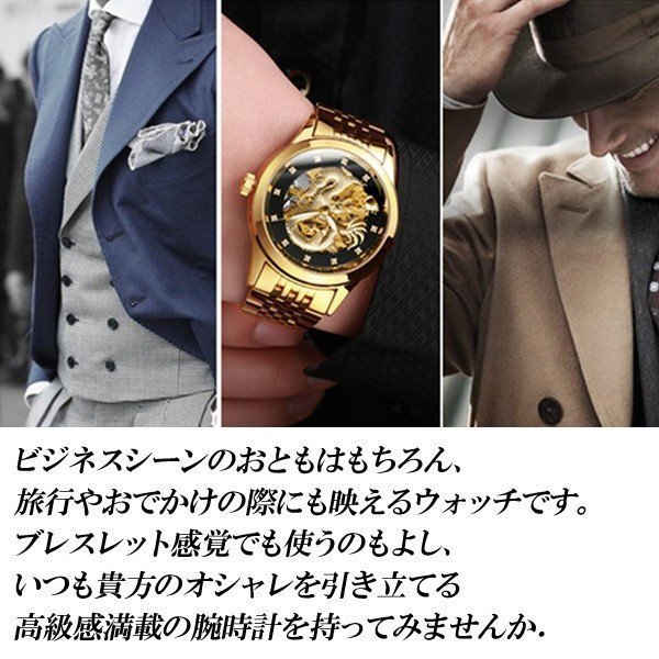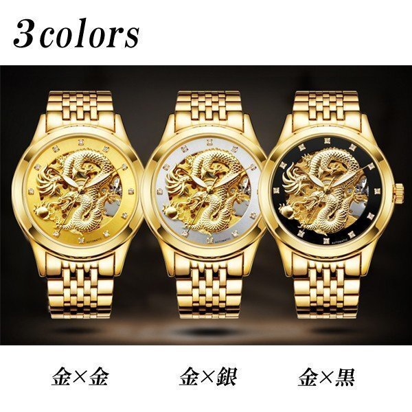 メンズ 精巧に作られた龍 ゴールド 自動巻き 高級腕時計 Dragon 人工ダイヤ 電池交換不要 ラインストーン 送料無料 7M◇ 竜腕時計:金x銀