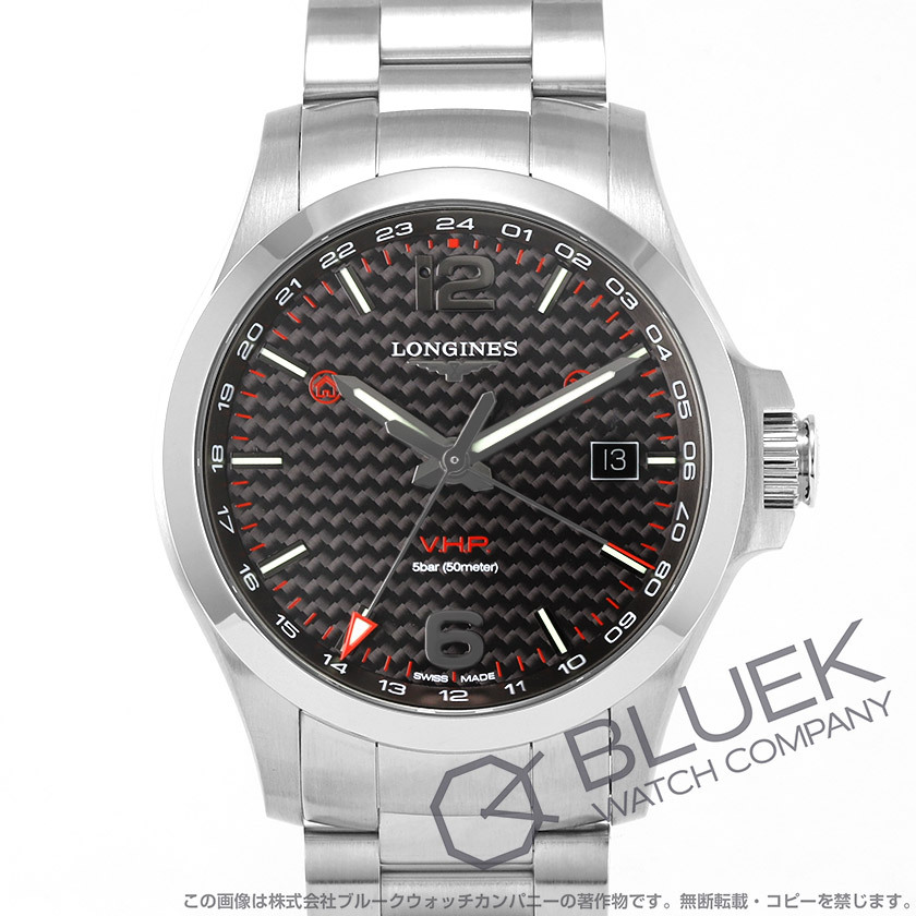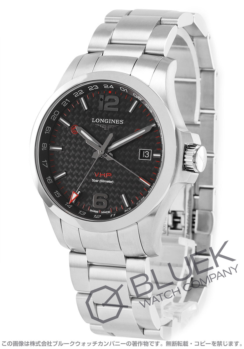 | シルバーケースにブラックのダイアル&3連ブレスがスポーティな印象のコンクエストV.H.P.はカーボン製ダイヤル外縁の24時間計と先端の赤いGMT針で2つ目の時刻が読み取れる人気のGMTウォッチ。日付調整不要なパーペチュアルカレンダーを3時の窓に表示し、指針とインデックスには夜光塗料が塗布されて暗所でも視認性を発揮します。中でも超高精度クオーツを搭載し、年差±5秒、月差わずか0.5秒以下を実現したこのモデルは、インデックス内周の2時10時にホームタイムとローカルタイムを意味する家と飛行機の赤いマークが配されて国内外問わず活躍します。 |