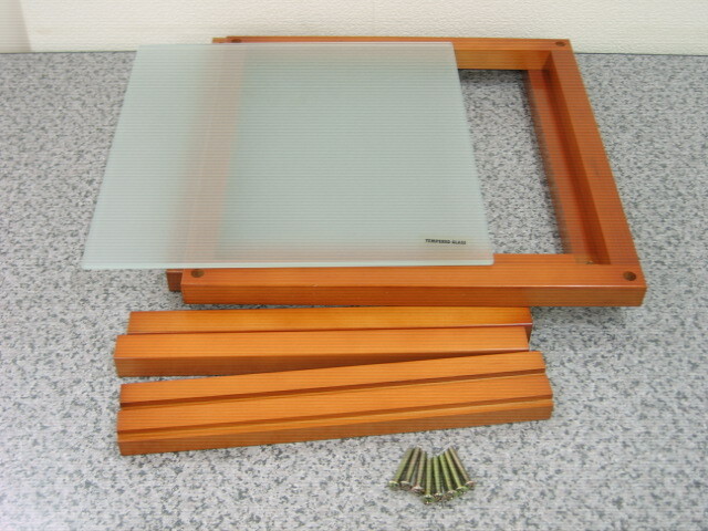 枠は木製で塗装仕上げ、天は5ミリの強化ミストガラスです。