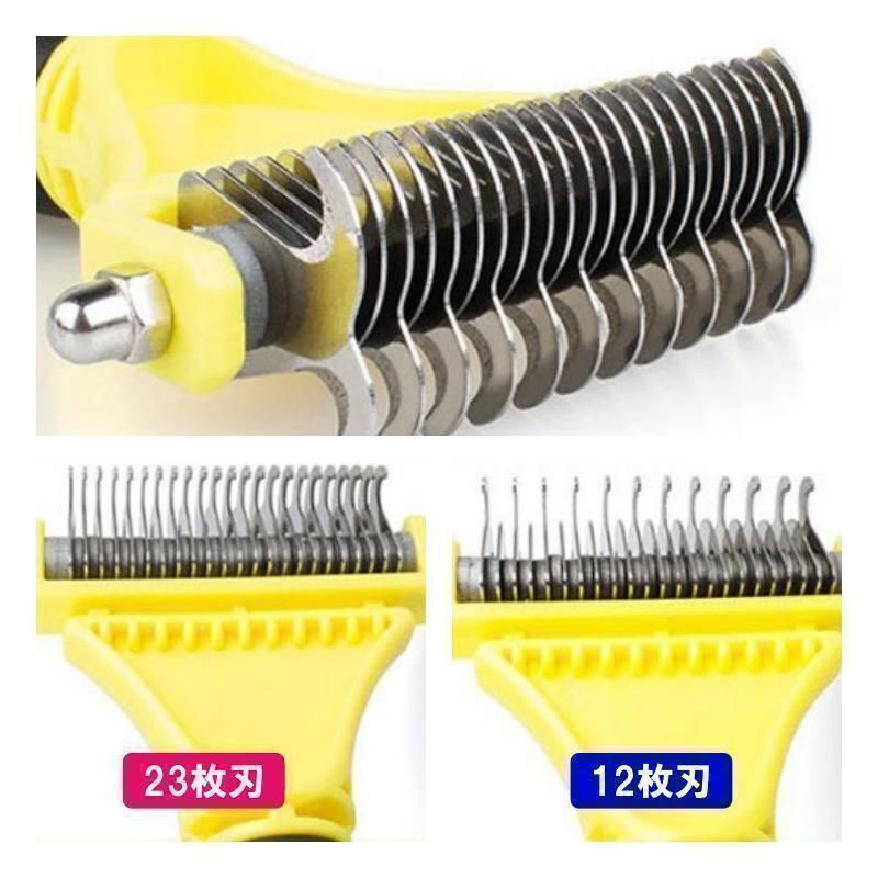 粗目(12枚刃)で毛並みを整え毛玉やもつれをほどき、細目(23枚刃)でほどけた毛をガッツリ除毛します。