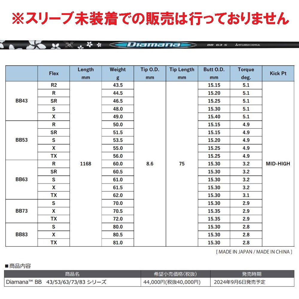 新品 三菱ケミカル ディアマナBB 各種スリーブ付シャフト オリジナルカスタム Diamana BB ディアマナ 青マナ