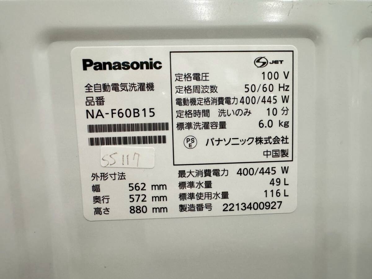 大阪送料無料★3か月保障付き★洗濯機★パナソニック★6kg★2022年★NA-F60B15★SS-117