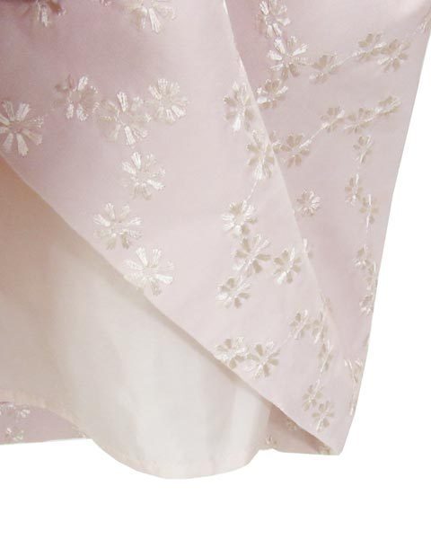 | 優しいお色使いの上品でフェミニンなワンピース。スカート部分の光沢のある刺繍が全体に入っていて華やかな雰囲気。お出かけスタイルにおすすめです。 |
