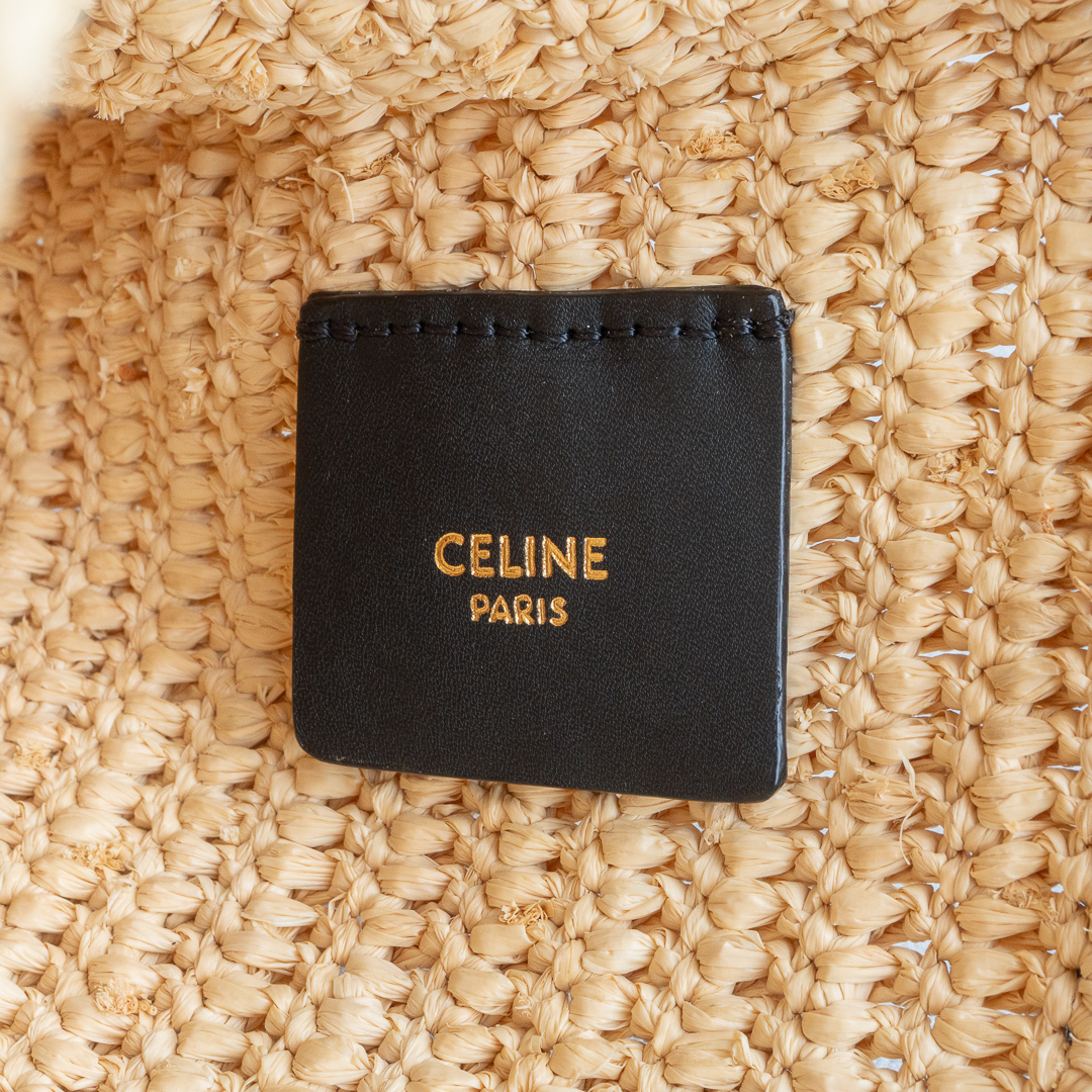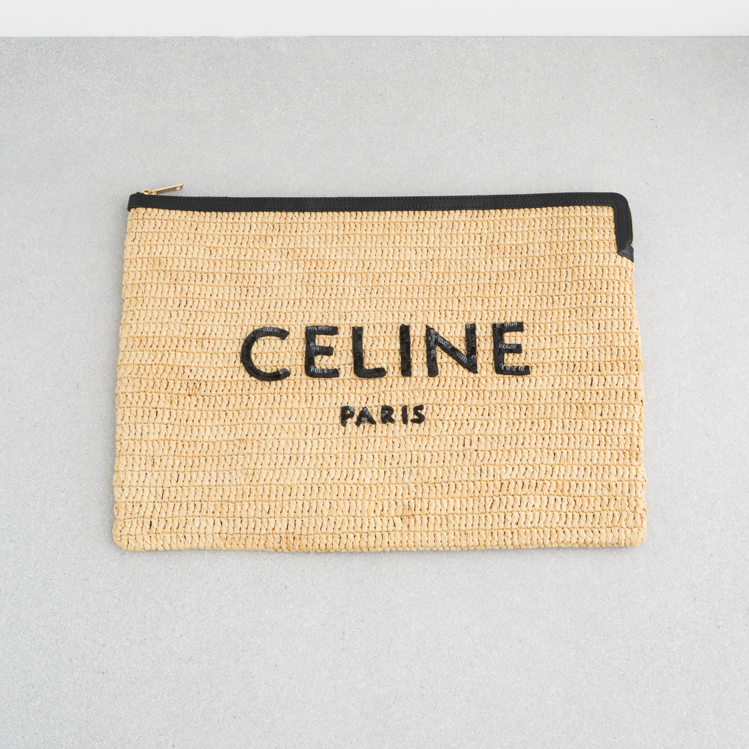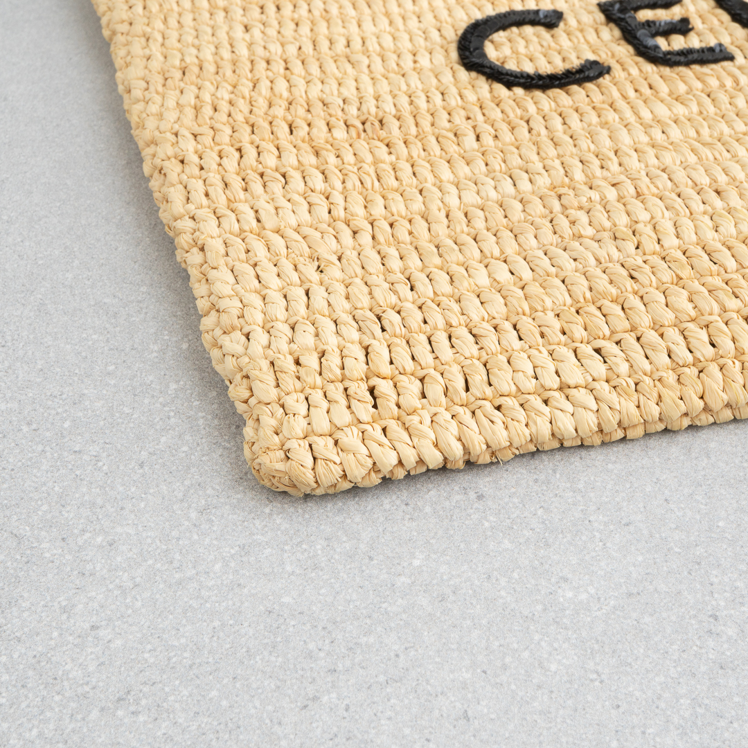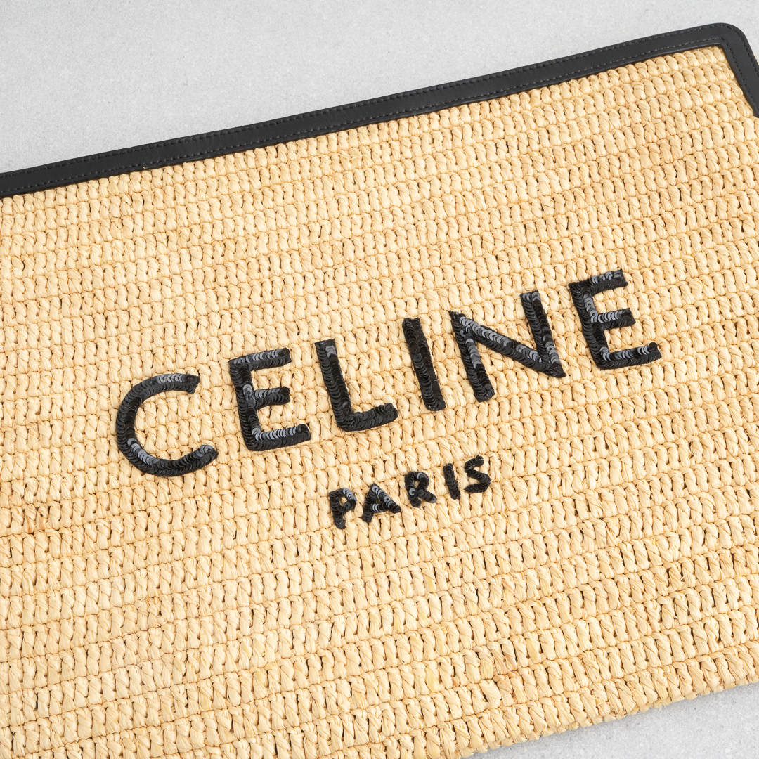ナチュラルなラフィア素材に、モダンなブラックのCELINEロゴをあしらったデザイン。ロゴ部分はスパンコール仕立てで、きらりと軽やかなアクセントを添えます。A4書類や11インチiPad、13インチノートパソコンも入るサイズ感で、クラッチとしてはもちろんポーチ使いもOK。デイリーにさらりと持てる、頼れるアイテムです。