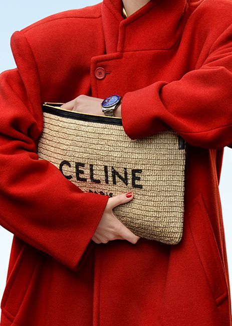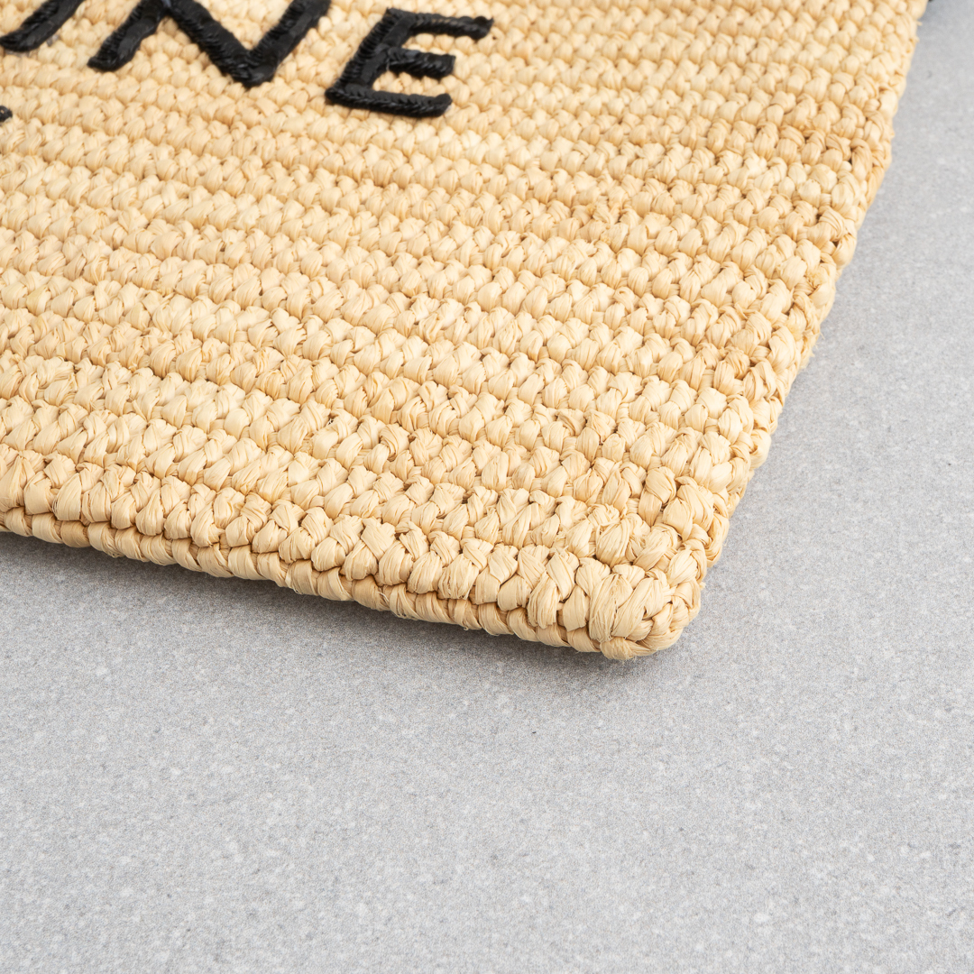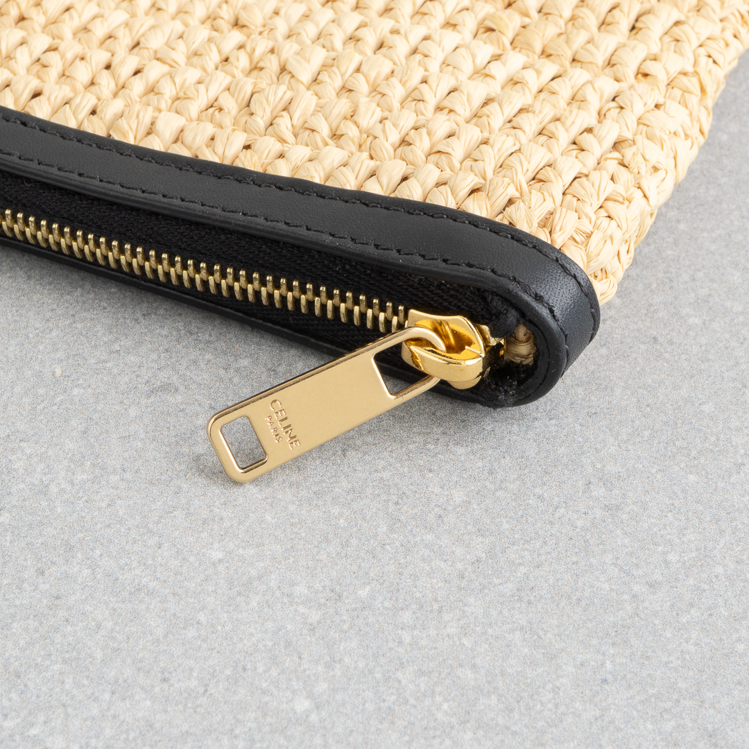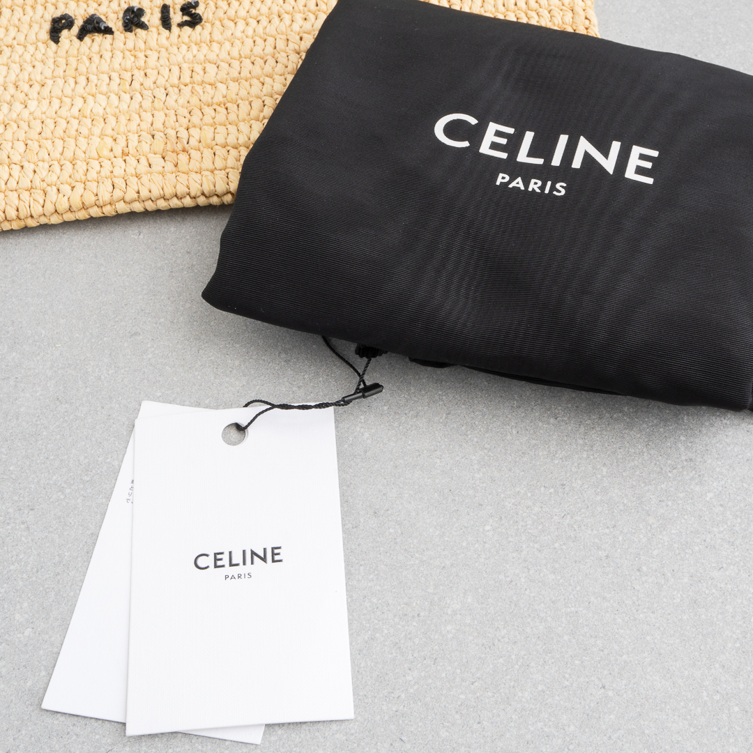 ナチュラルなラフィア素材に、モダンなブラックのCELINEロゴをあしらったデザイン。ロゴ部分はスパンコール仕立てで、きらりと軽やかなアクセントを添えます。A4書類や11インチiPad、13インチノートパソコンも入るサイズ感で、クラッチとしてはもちろんポーチ使いもOK。デイリーにさらりと持てる、頼れるアイテムです。
