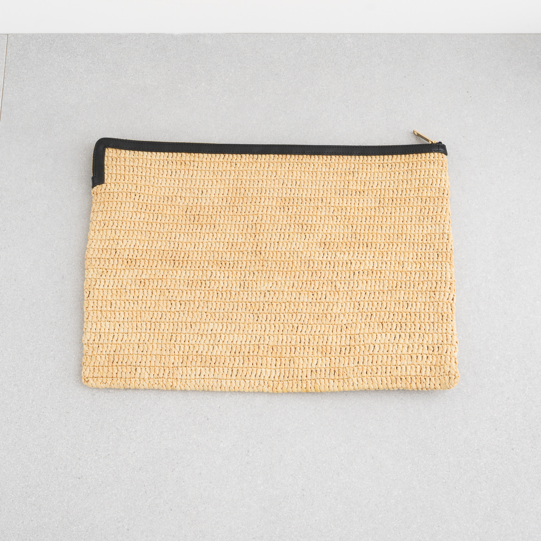 涼しげなラフィアのミニマルなクラッチバッグ。