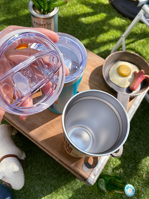 シリコンパッキン付きのフタが付いてるので持ち運びの時も便利だし、普段はフタを外して開けっぱなしで快適にタンブラーとして使えるんですよ!