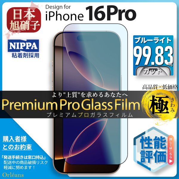 iPhone 16 Pro ブルーライトカット 強化ガラスフィルム 旭硝子 全面保護 自動吸着 保護フィルム 液晶保護フィルム