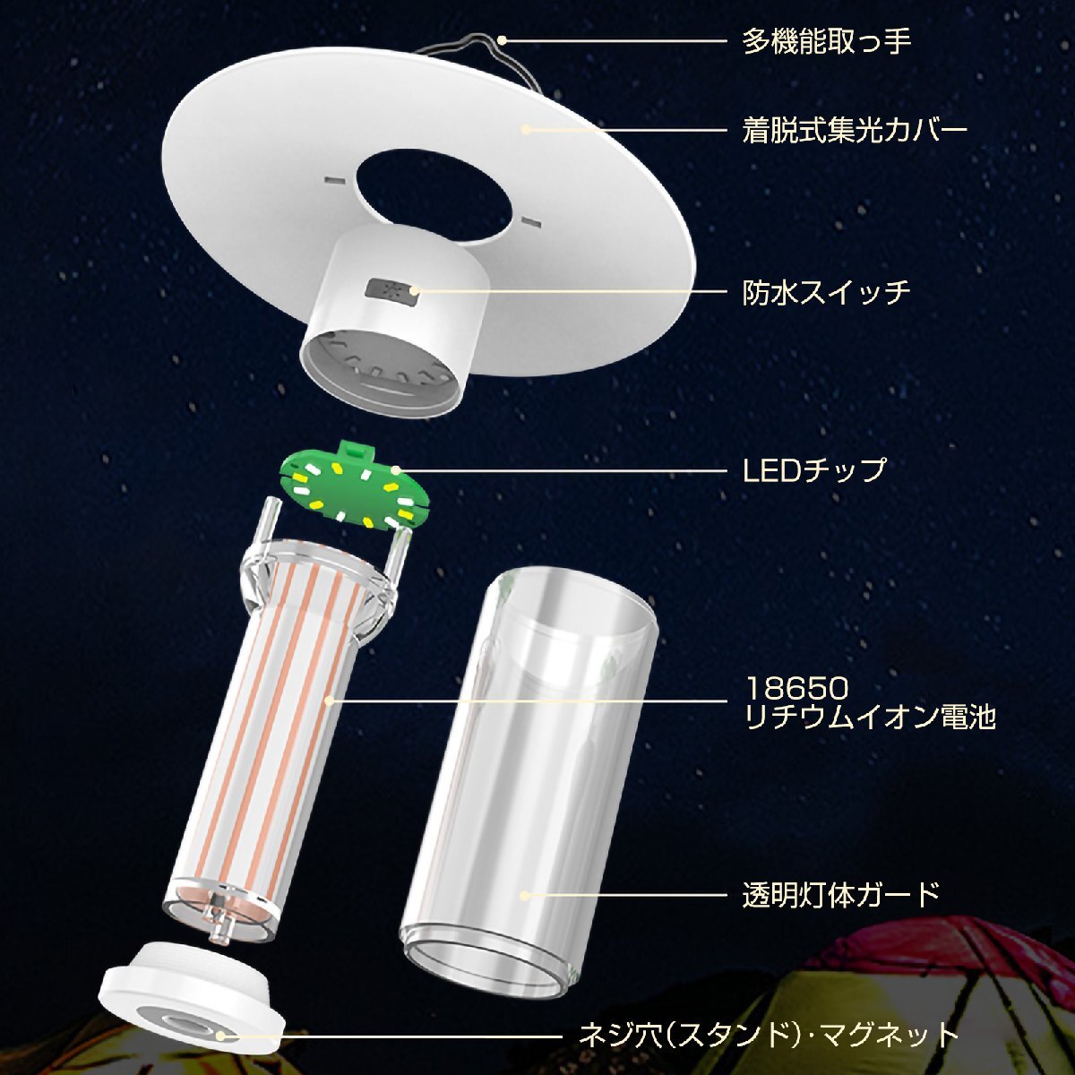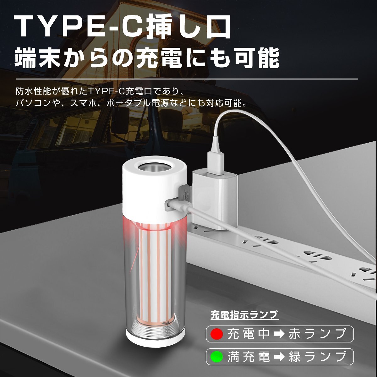 | 本体のサイズ | W120*H35*D105mm | セット内容 | ライト本体、三脚スタンド、集光カバー、TYPE-C充電ケーブル、取扱説明書、仕様書 |