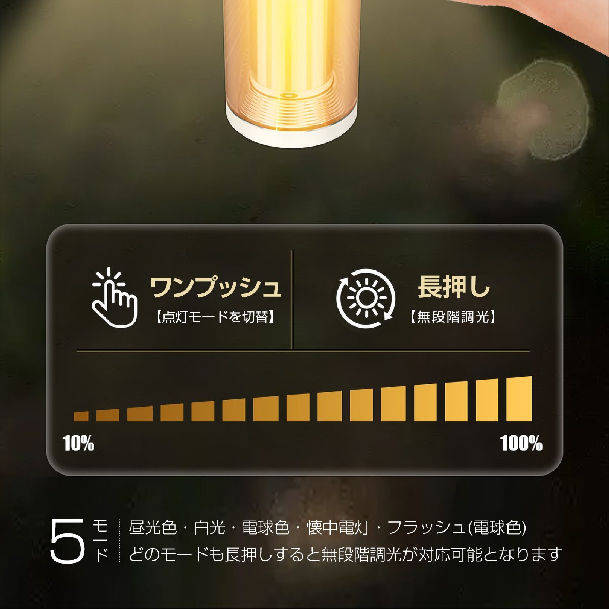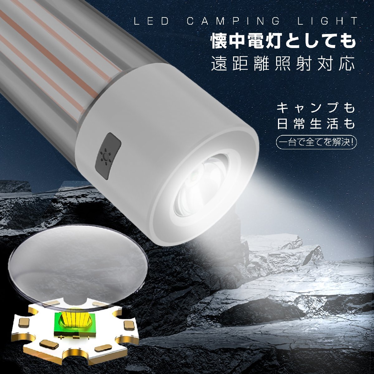 | 点灯モード | 5モード:昼光色・白光・電球色・懐中電灯モード・フラッシュ(黄色) | 防水等級 | IPX4(生活防水) |