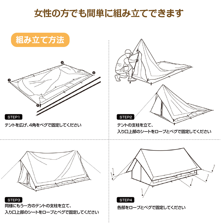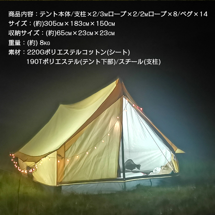 【商品内容】:テント本体/支柱×2/3mロープ×2/2mロープ×8/ペグ×14