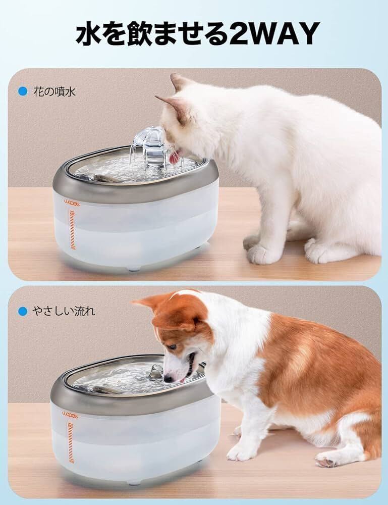 【2WAY給水モード】噴水モードで、花の噴水口から水が流れて、猫ちゃんに大歓迎!湧泉モードは、やさしい流れで、猫ちゃんに新鮮な水を提供します。停電しても、80mlの水をトレイに貯めます。停電も心配なしに!ご注意:プラグが付属していません。