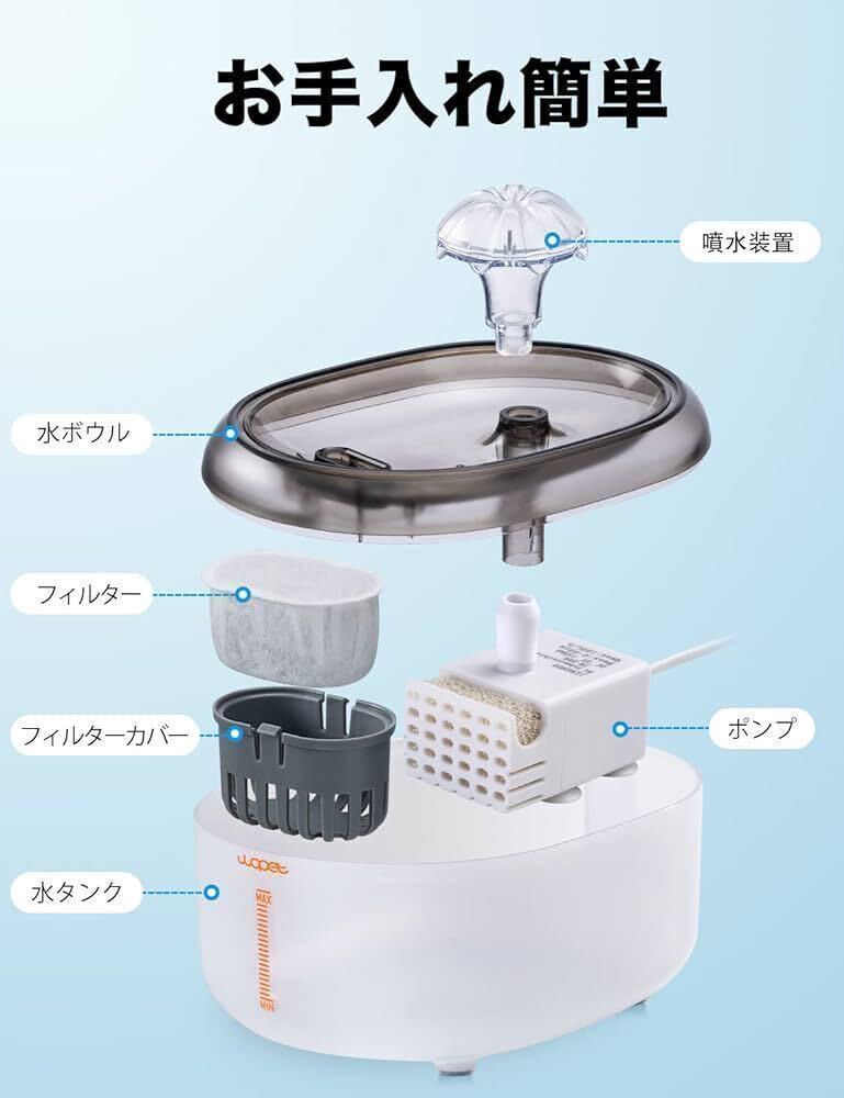 【設置&お手入れ簡単】ポンプとフィルターを取り付けるだけで設置完了です。お手入れもカンタンです。本体やパーツはすべて丸洗いができるので、常に清潔に保つことができ、初めて使う飼い主さんでも安心して使用可能です。※ご注意:最初に使用する前に、フィルターを清潔なボウルに5分間浸し、30秒間すすぎ洗いしてください。