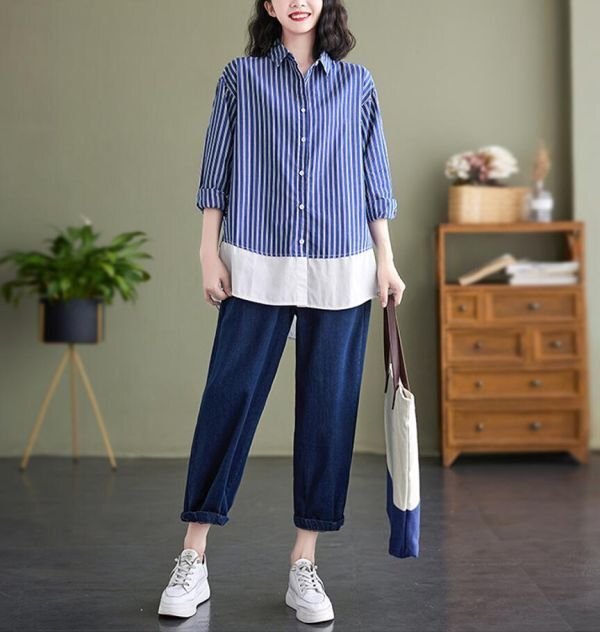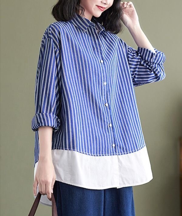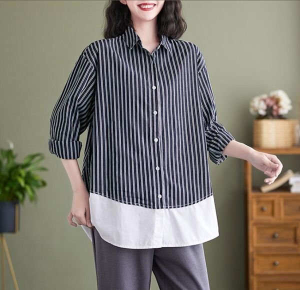 チュニック シャツ ボーダー柄 切り替え ブラウスシャツ シンプル 大きいサイズ 長袖 トップス★黒/Mサイズ
