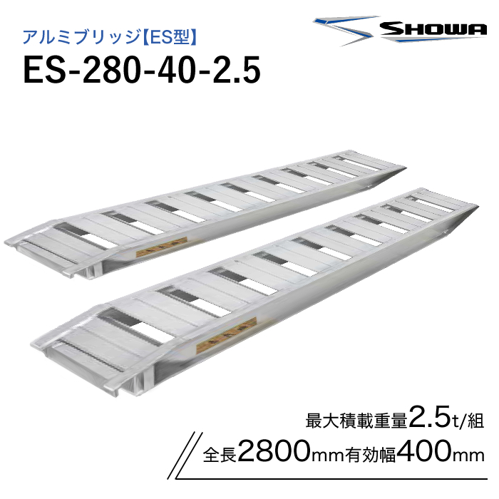 積載重量は1本あたり1.25トンです 昭和ブリッジ 2.5トン(2.5t)ツメ式 全長2800mm/有効幅400mm【ES-280-40-2.5】2本組 全幅400mm自重23.5kg/1本 | ||