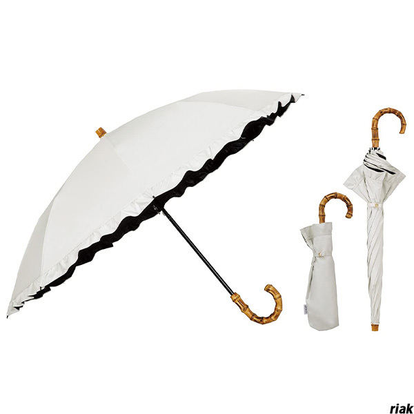 【2WAYで使える遮光折りたたみ傘】 完全遮光日傘 UVカット100% 晴雨兼用 バンブーハンドル フリルデザイン 長傘/折りたたみ