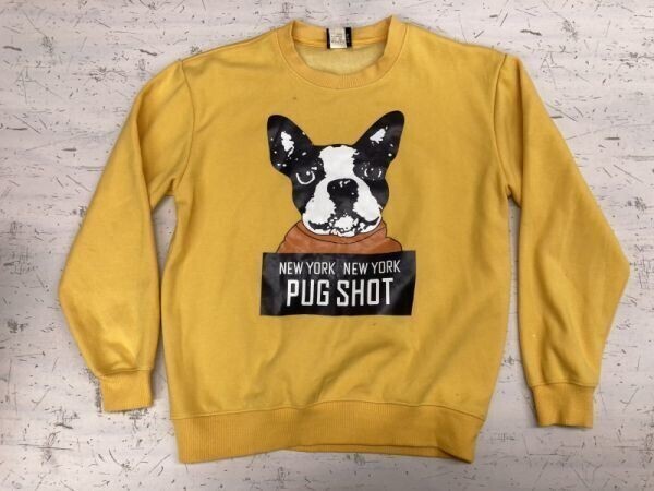 hey big スポーツウェア アメカジ キャラクター 転写プリント 犬 パグ ワンちゃん スウェット トレーナー レディース 黄色 です。