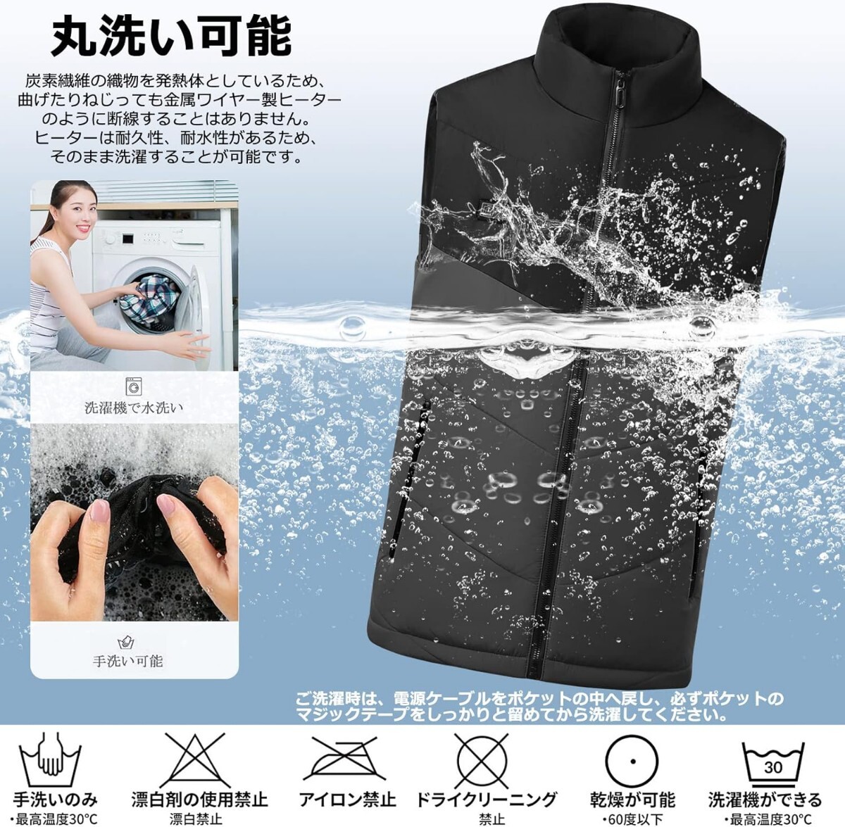 【洗濯機に対応】炭素繊維の織物を発熱体としているため、曲げたりねじっても金属ワイヤー製ヒーターのように断線することはありません。ヒーターは耐久性、耐水性があるため、そのまま洗濯することが可能です。※洗濯の際に、過度な力を加えないでください。