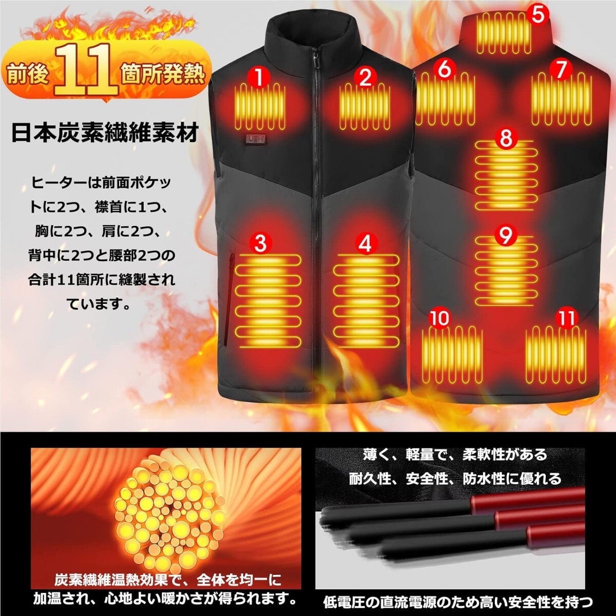 電熱ベスト 11箇所発熱 電気ベスト 充電式 日本炭素繊維材 暖房ベスト 薄型 即暖 防寒インナー 丸洗い可 屋外ベスト NTC安全チップ内蔵 登山 通勤 通学 温度3段階 男女問わず 秋冬 ヒートベスト クリスマス プレゼント