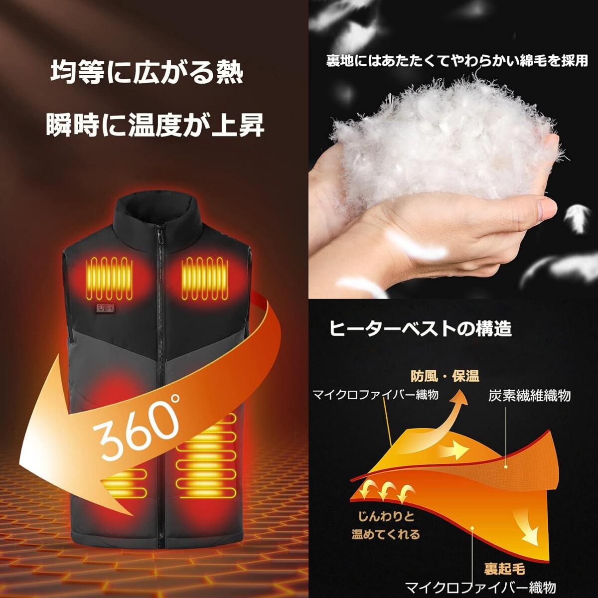 【NTCセンサー】NTCセンサー内蔵されたため、自動的に温度を調整し、過熱を防ぎます。寒い時期のアウトドア活動、外回り、現場仕事、通学通勤など「炭素繊維発熱ベスト」の温熱効果で、全体を均一に加温され、心地よい暖かさが得られます。