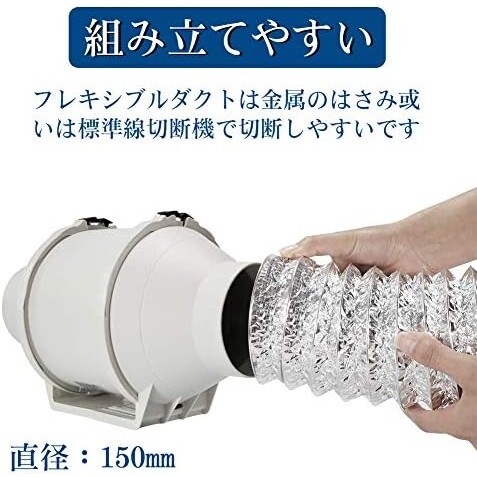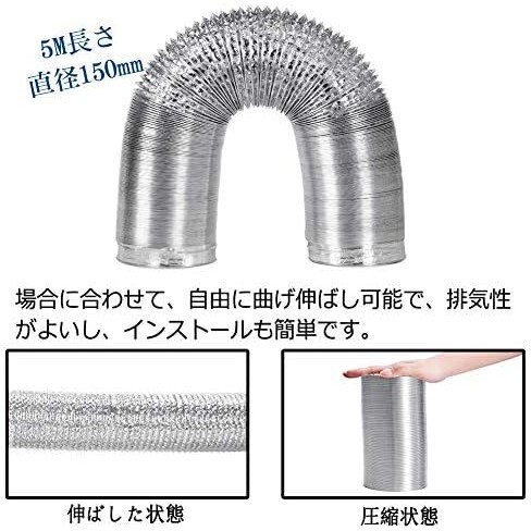 フレキシブルダクト:サイズ:150mm(直径)5m(長さ) 耐久性あるダブル厚さのアルミ箔もあるプラテンで作られたばかりでなく、高密度で耐腐蝕のヘリカルスレッドも組み立たれる。