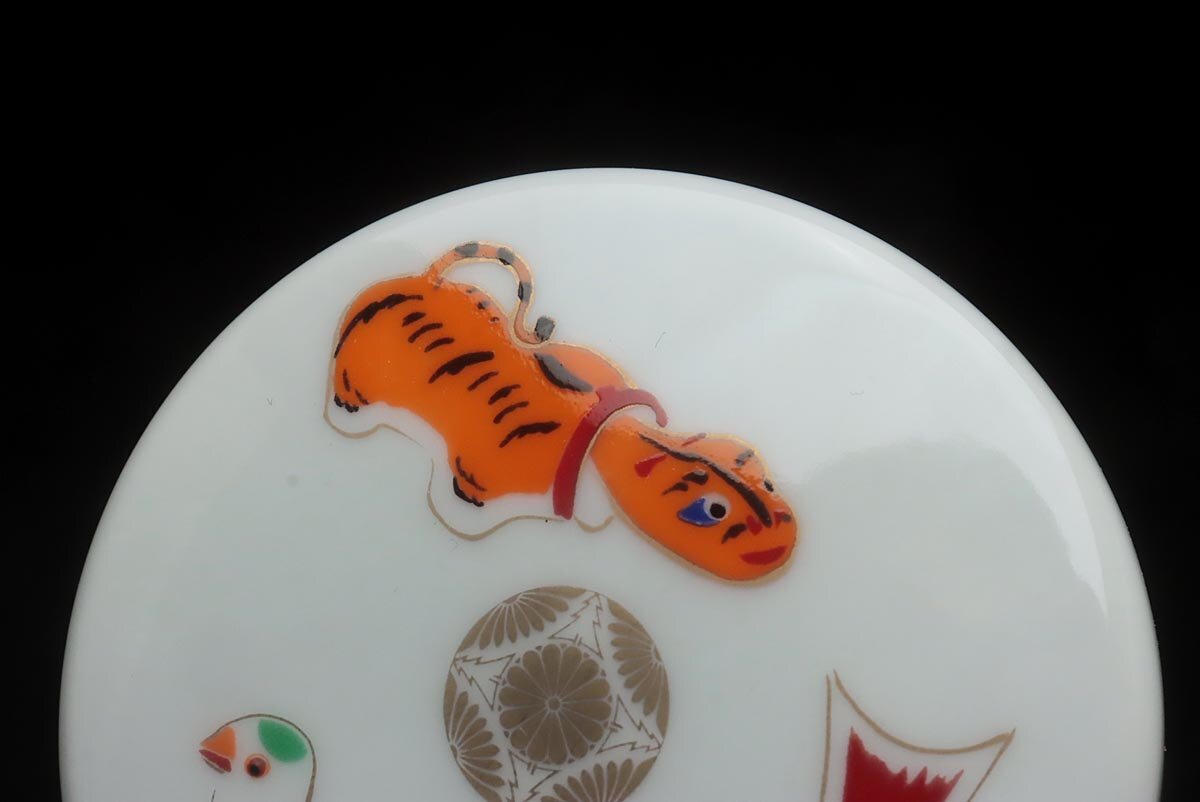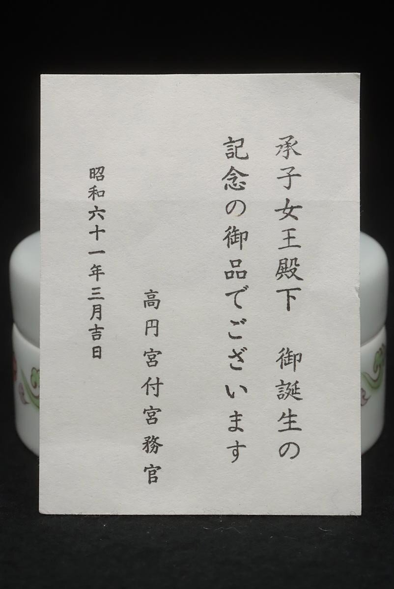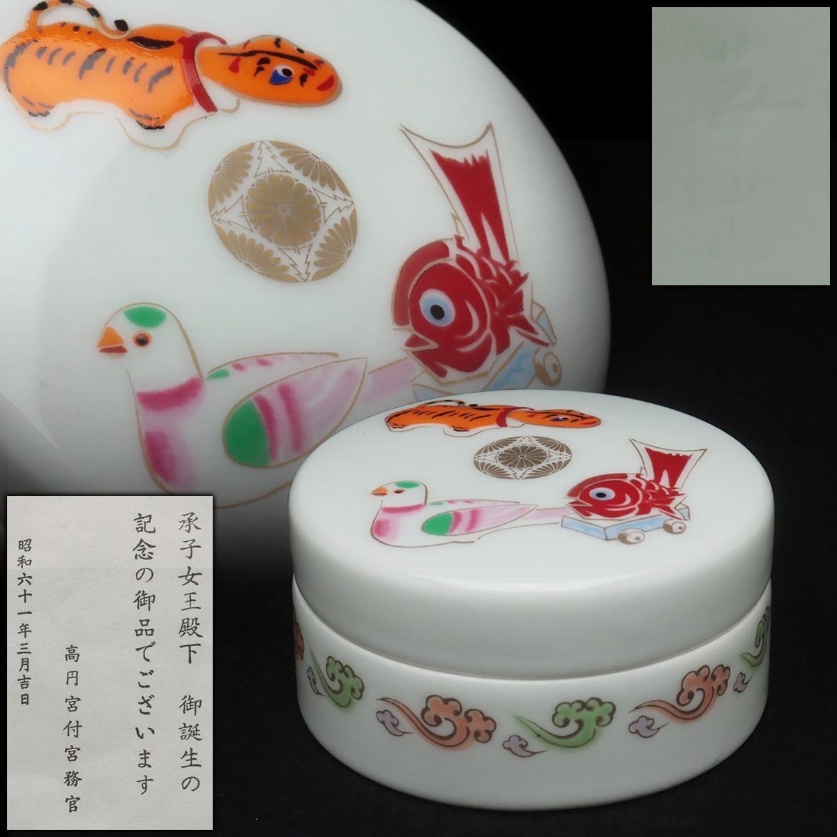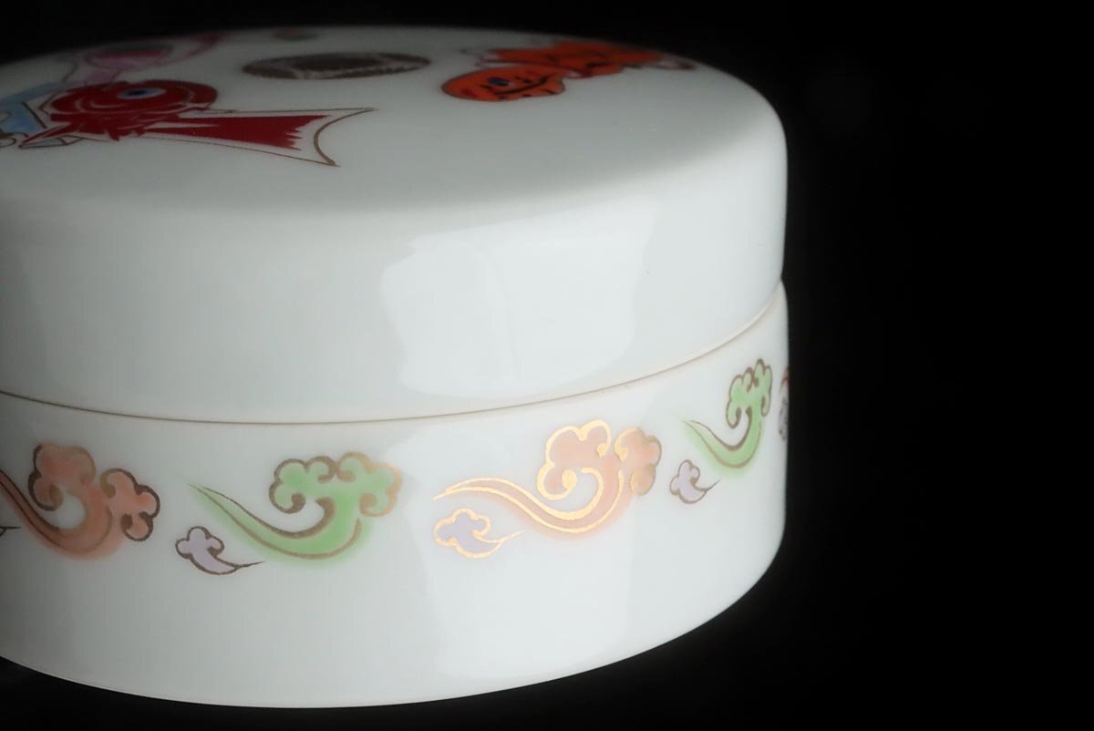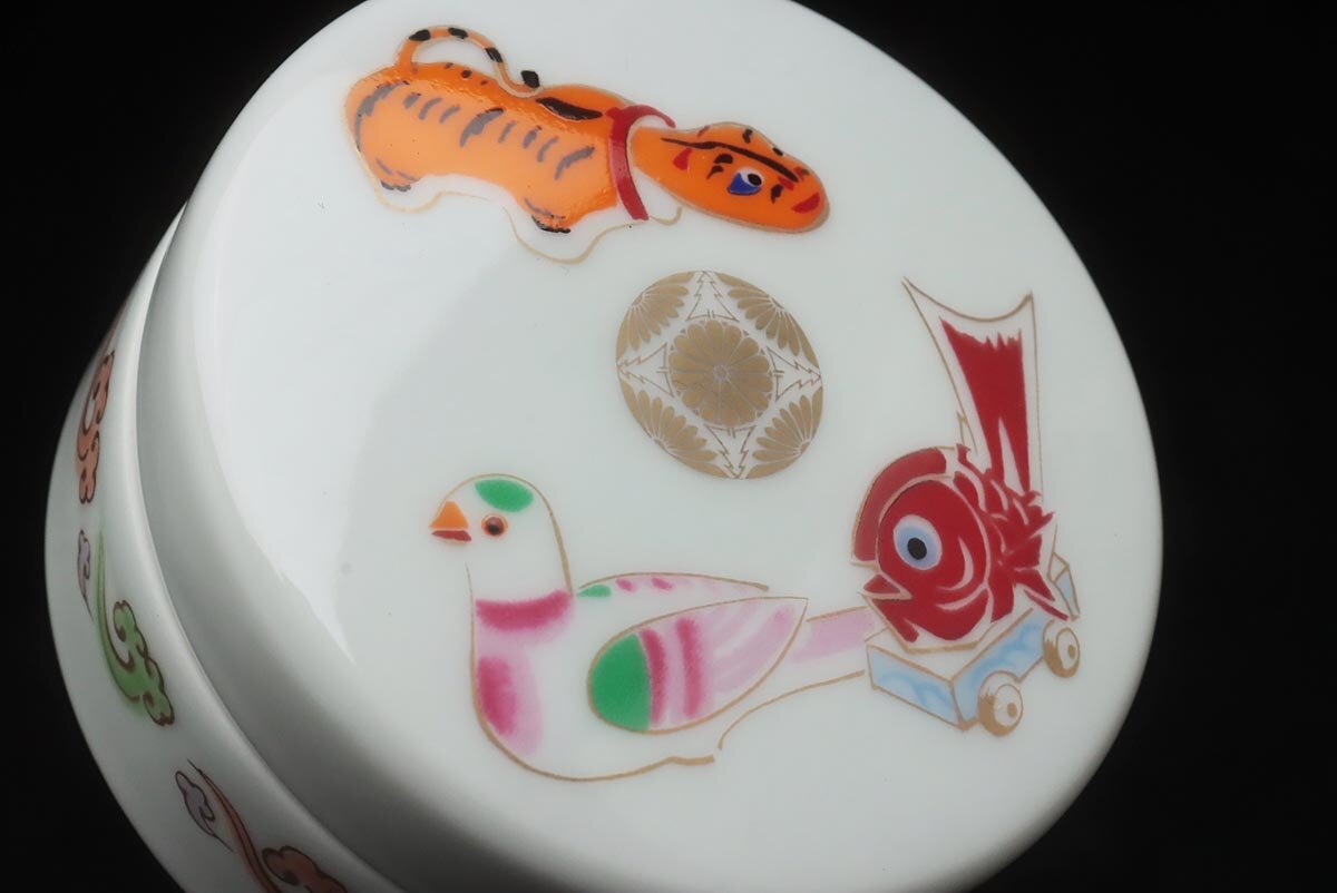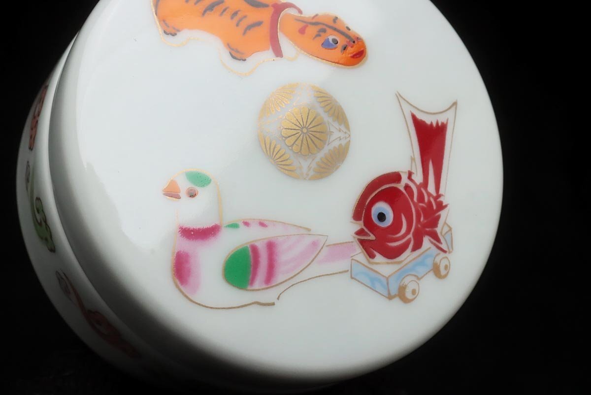 | ◆ 皇室下賜品【華山 造】昭和61年 高円宮家 長女承子誕生記念 菊花紋章入 色絵 玩具文 ボンボニエール・菓子器 木箱付 ◆