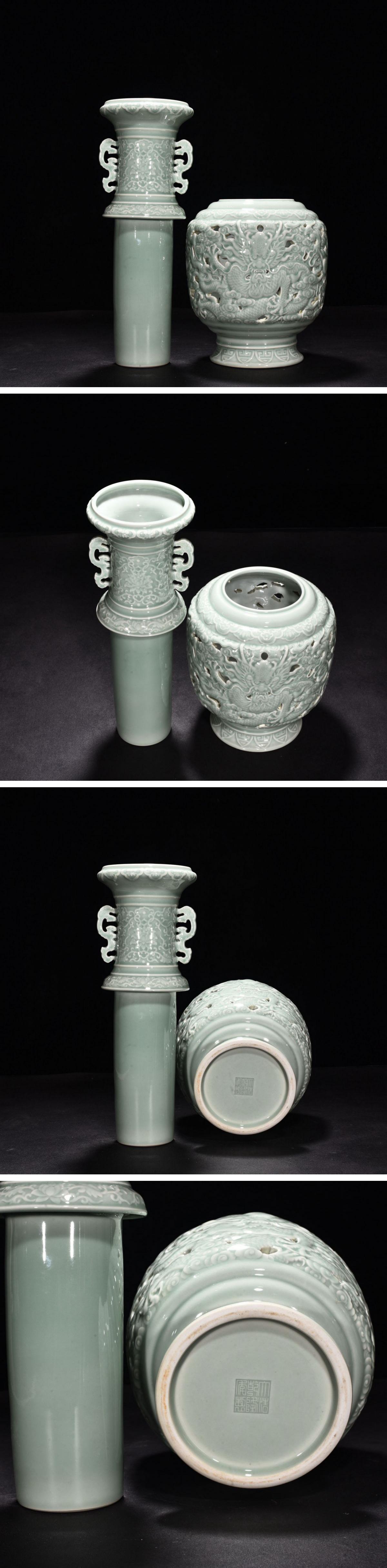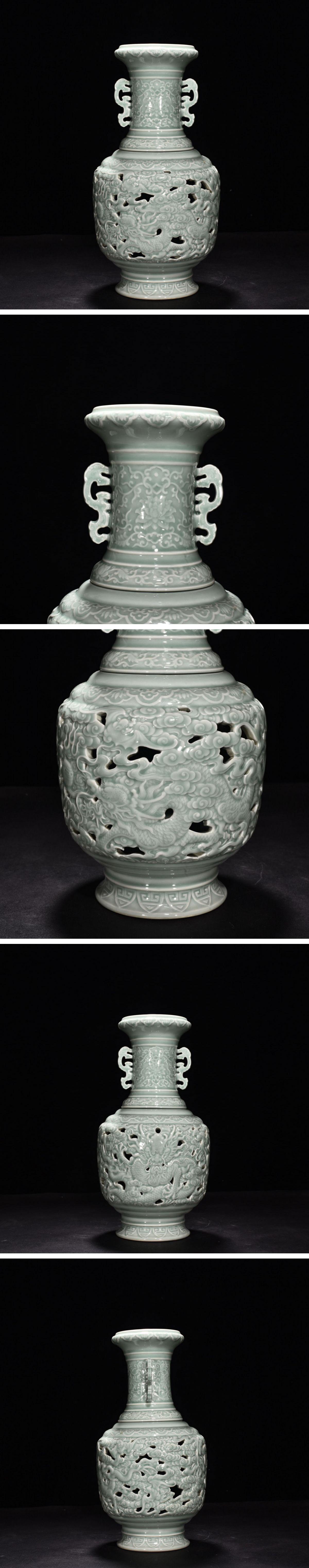 【清】某有名オークション購入 清時代 乾隆年製 官窯青磁刻龍文転心瓶 当時物 古置物 古擺件 古美術 時代コレクション7L10-UY5