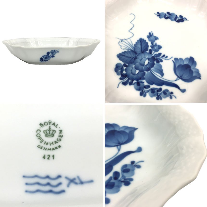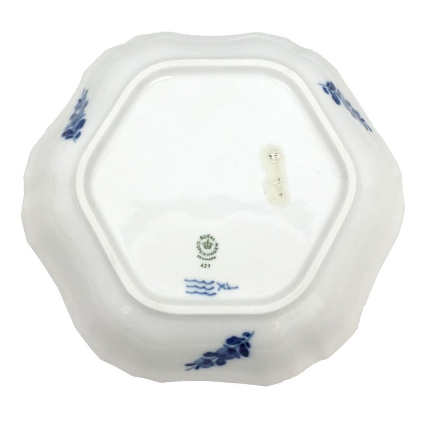 | PRコメント | ロイヤルコペンハーゲン プレート ■ブルーフラワーカーブ 六角形 皿 ロイヤルコペンハーゲン ブルーフラワーカーブの六角型プレートになります。 1775年にクリスチャン7世国王とユリアナ・マリア王太后の援助によって「ロイヤルコペンハーゲン」が王室御用達窯となりました。 ブルーフラワーは白磁に鮮やかなコバルトブルーの繊細な花模様が描かれたシリーズです。 大きなブーケは、ペインターがチューリップやバラ、けし、カーネーション、マーガレット、アスターなど、15から20種類の花から選び、自由に組み合わせて描かれています。 そのため、ひとつひとつのブーケが異なるのも魅力で、世界に一つしかない逸品になります。 プレイン・カーブ・アンギュラーの3パターンの中で、地模様にカーブのラインが入っているものをブルーフラワーカーブといい、花の組み合わせがさらに豪華で優雅なデザインとなっています。 |