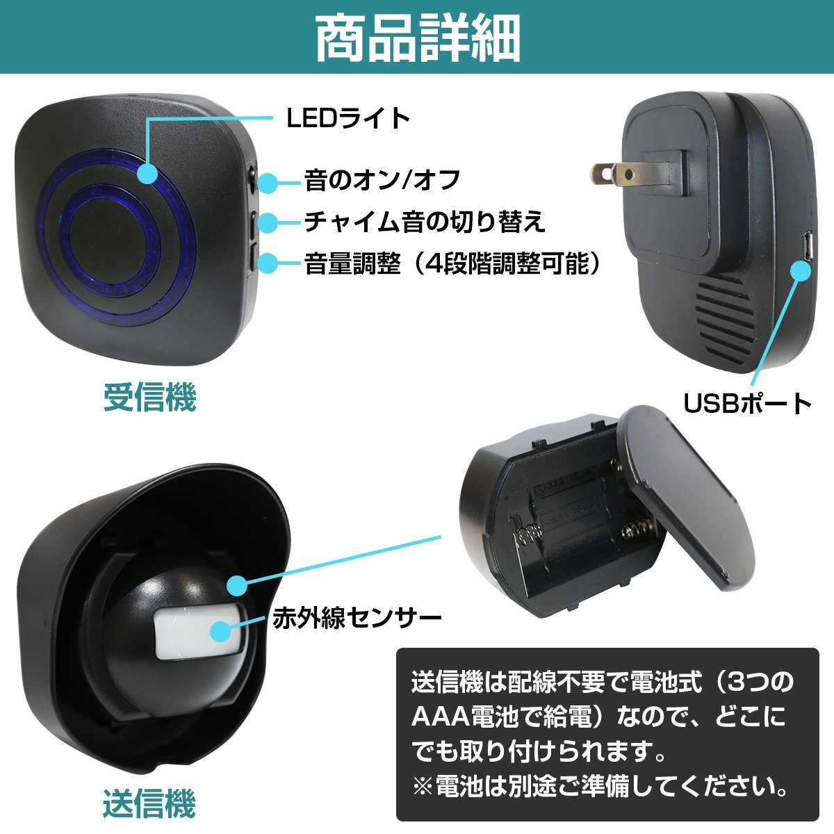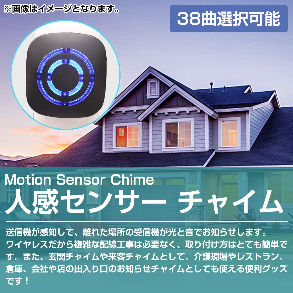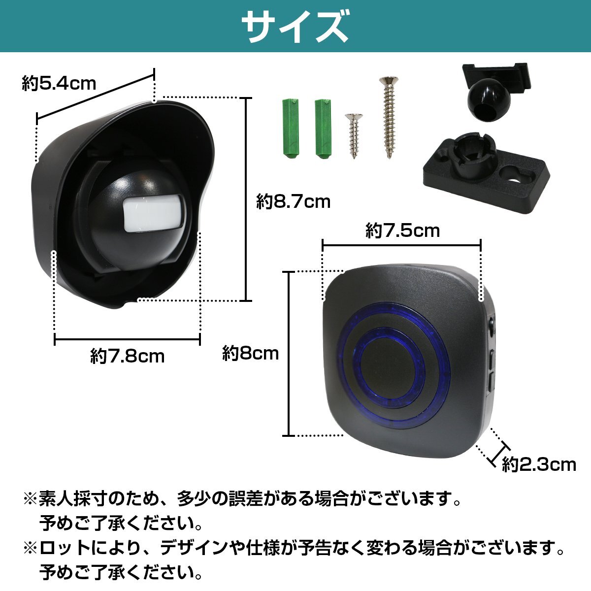 人感センサー ワイヤレスチャイム 自宅 店舗 事務所 倉庫 来客をチャイムでお知らせ 玄関 インターホン 送受信機 セット 黒