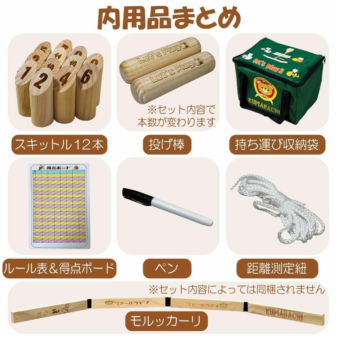 〇【基本の楽しみ方】投棒を投げ、スキットルを倒します。 スキットルを倒し、そのスキットルに印字された数字が獲得できたり、複数のスキットルを倒したり、スキットルの数と同等のポイントを獲得します。 めざせ50点!